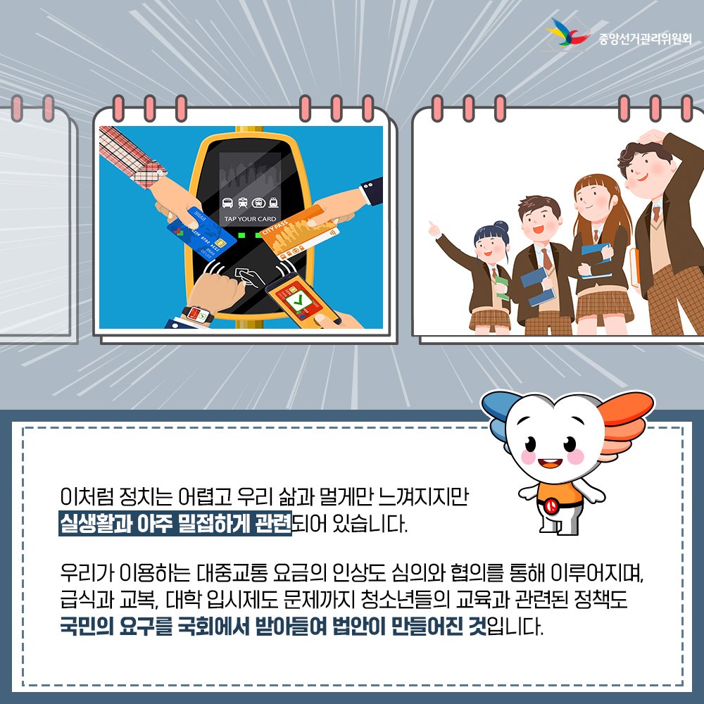 이처럼 정치는 어렵고 우리 삶과 멀게만 느껴지지만 실생활과 아주 밀접하게 관련되어 있습니다.