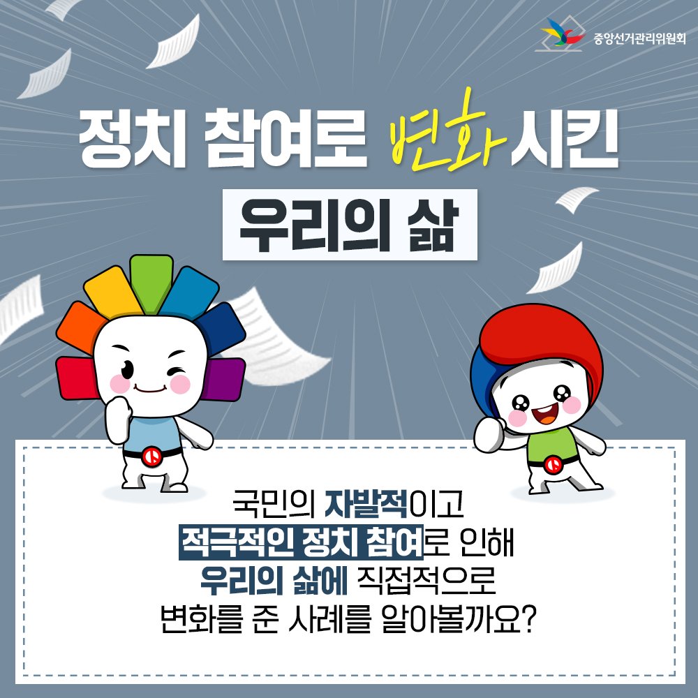 국민의 자발적이고 적극적인 정치 참여로 인해 우리의 삶에 직접적으로 변화를 준 사례를 알아볼까요?