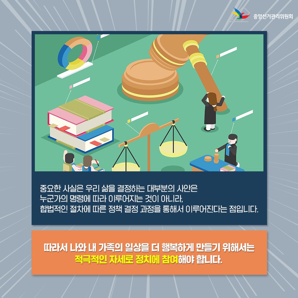 따라서 나와 내 가족의 일상을 더 행복하게 만들기 위해서는 적극적인 자세로 정치에 참여해야 합니다.