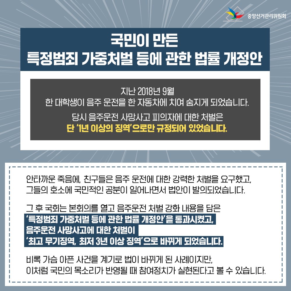 비록 가슴 아픈 사건을 계기로 법이 바뀌게 된 사례이지만, 이처럼 국민의 목소리가 반영될 때 참여정치가 실현된다고 볼 수 있습니다.