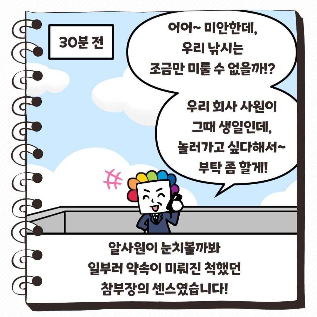 알사원이 눈치볼까봐 일부러 약속이 미뤄진 척했던 참부장의 센스였습니다!