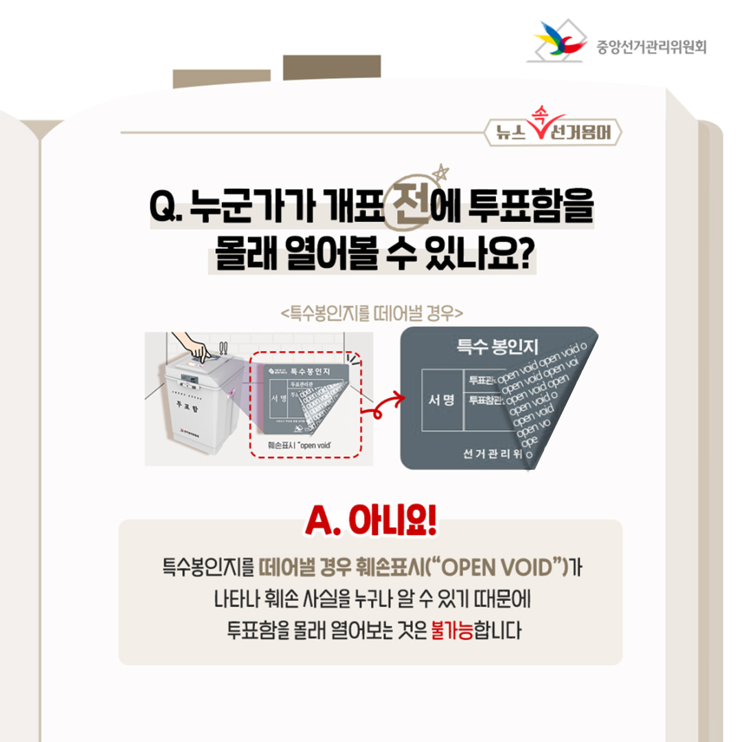 특수봉인지를 떼어낼 경우 훼손표지("OPEN VOID")가 나타나 훼손 사실을 누구나 알 수 있기 때문에 투표함을 몰래 열어보는 것은 불가능합니다