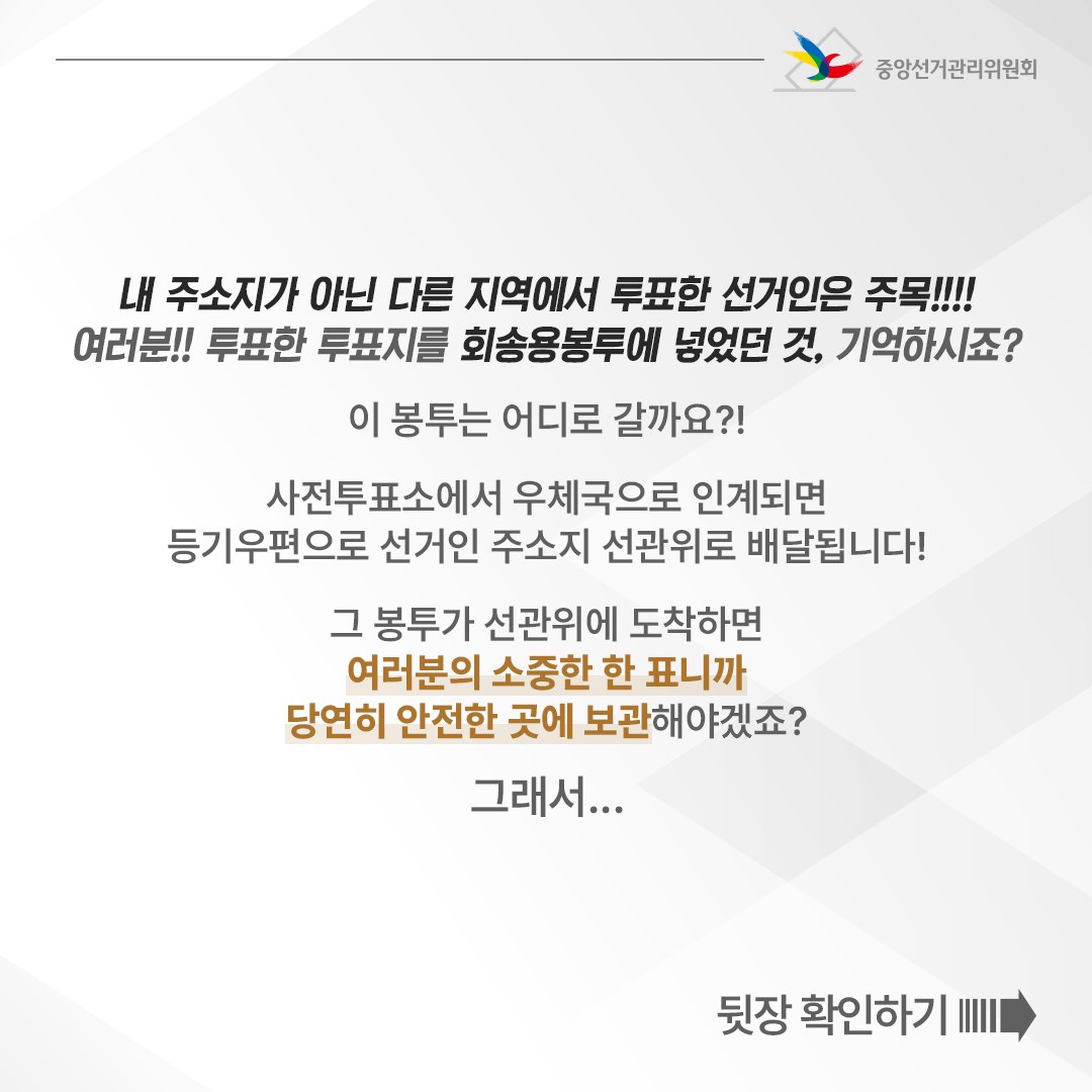 사전투표소에서 우체국으로 인계되면 등기우편으로 선거인 주소지 선관위로 배달됩니다!