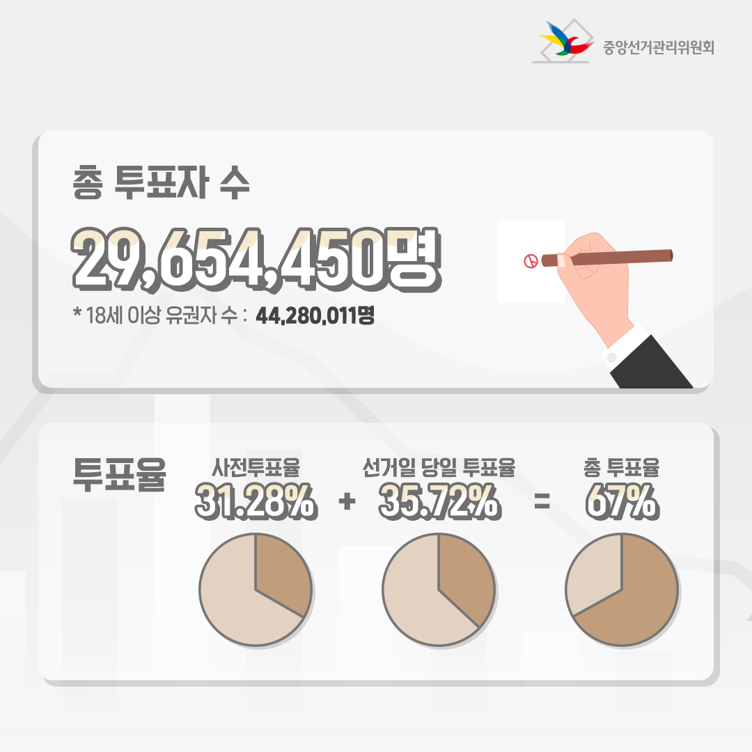 사전투표율 31.28% + 선거일 당일 투표율 35.72% = 총 투표율 67%