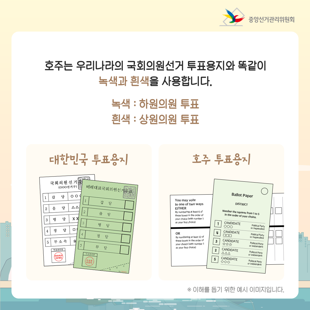 호주는 우리나라의 국회의원선거 투표용지와 똑같이 녹색과 흰색을 사용합니다.