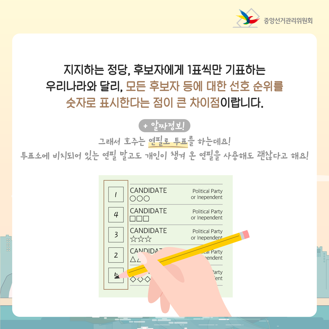 지지하는 정당, 후보자에게 1표씩만 기표하는 우리나라와 달리, 모든 후보자 등에 대한 선호 순위를 숫자로 표시한다는 점이 큰 차이점이랍니다.