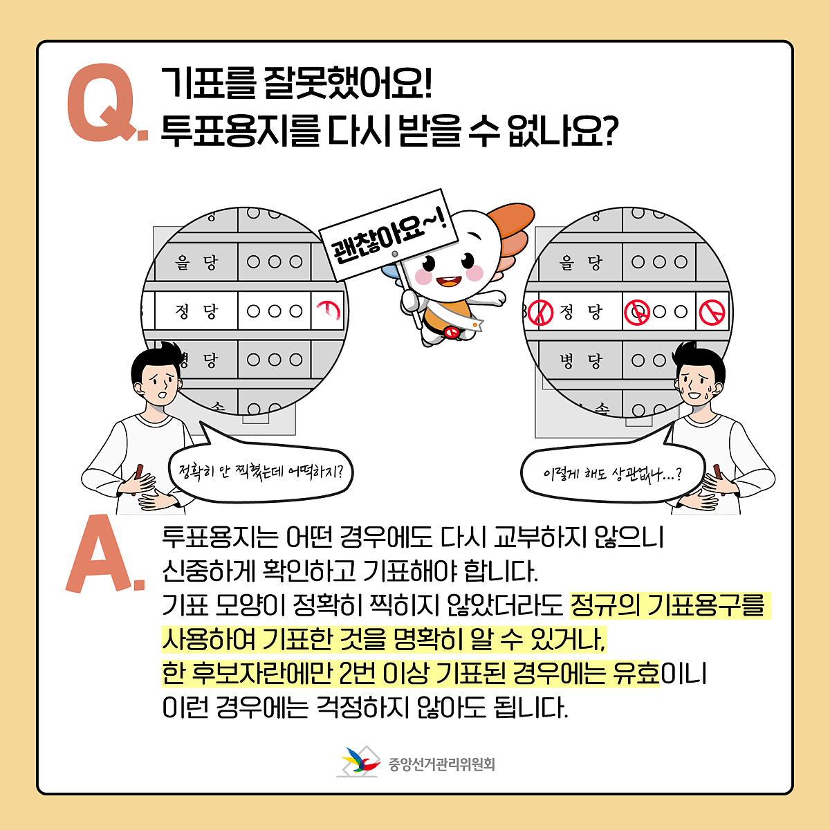 Q. 기표를 잘못했어요! 투표용지를 다시 받을 수 없나요?