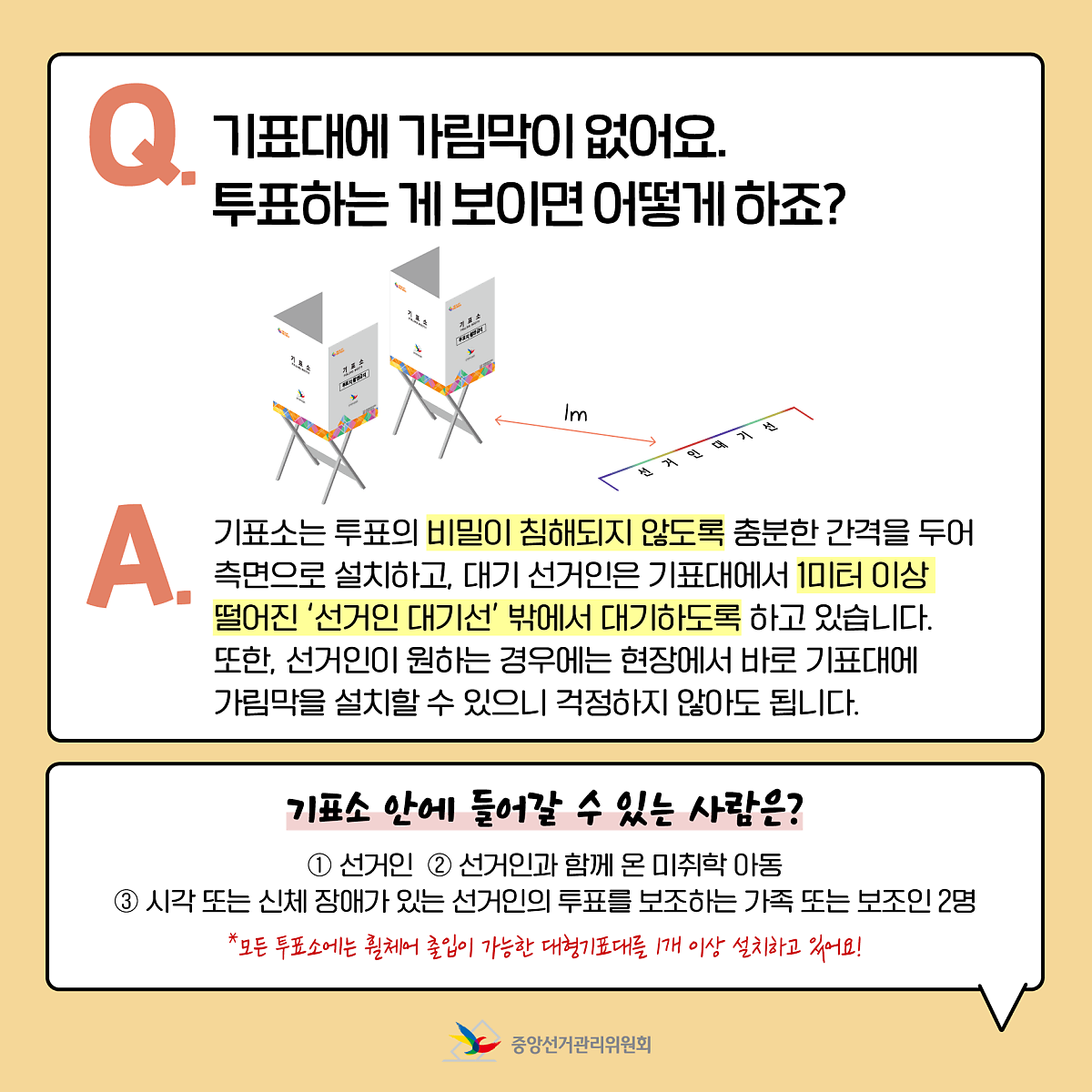 또한, 선거인이 원하는 경우에는 현장에서 바로 기표대에 가림막을 설치할 수 있으니 걱정하지 않아도 됩니다.