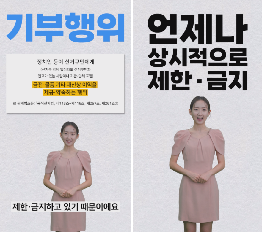「공직선거법」에 따라 정치인 등의 기부행위를 상시적으로 제한·금지하고 있기 때문이에요~
