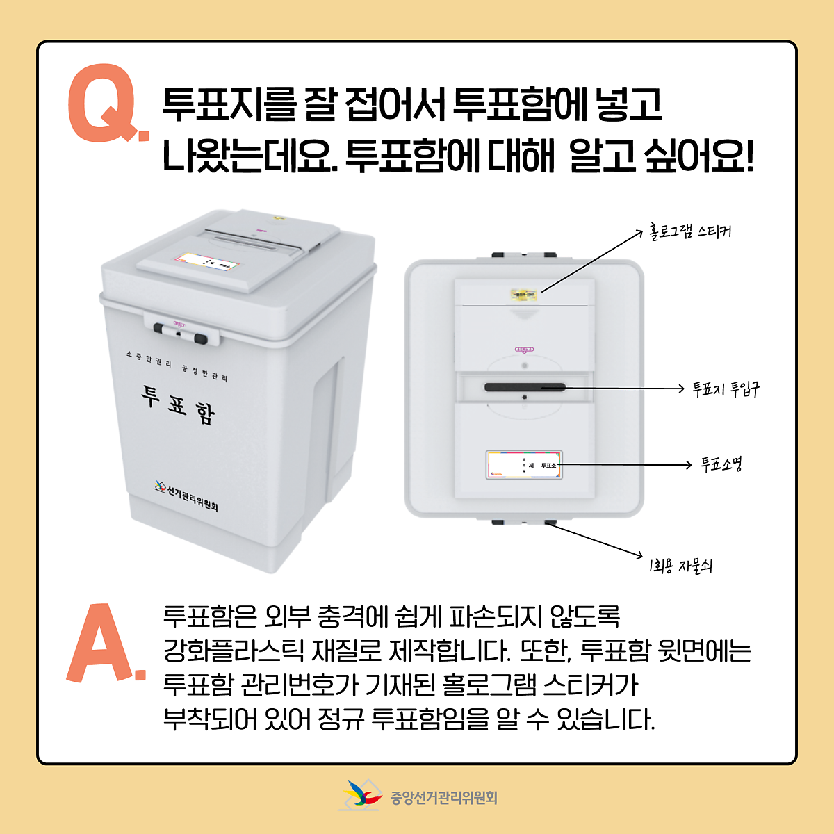 A. 투표함은 외부 충격에 쉽게 파손되지 않도록 강화플라스틱 재질로 제작합니다. 또한, 투표함 윗면에는 투표함 관리번호가 기재된 홀로그램 스티커가 부착되어 있어 정규 투표함임을 알 수 있습니다.