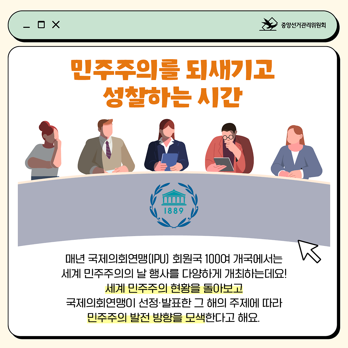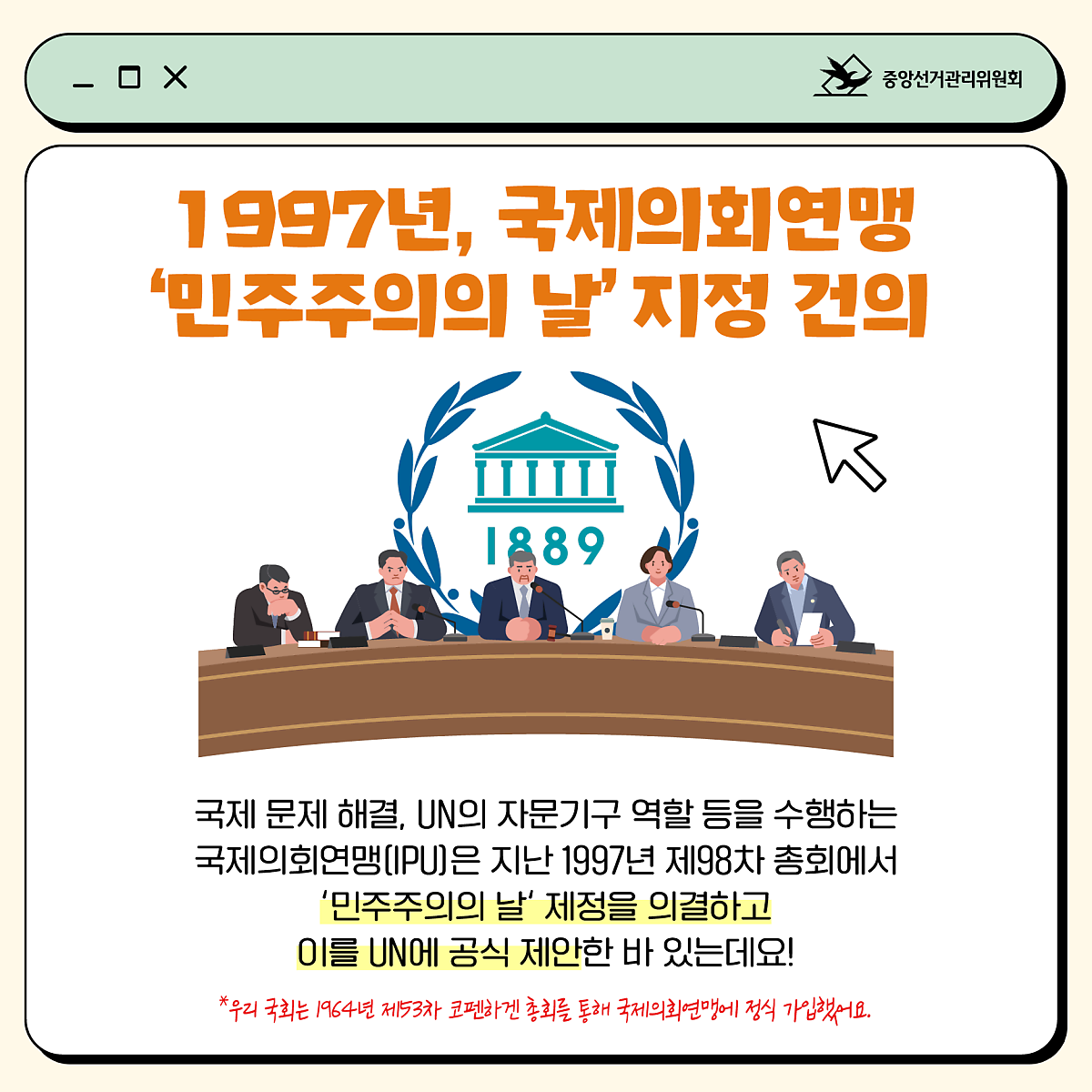 국제 문제 해결, UN의 자문기구 역할 등을 수행하는 국제의회연맹(IPU)은 지난 1997년 제98차 총회에서 '민주주의의 날' 제정을 의결하고 이를 UN에 공식 제안한 바 있는데요!