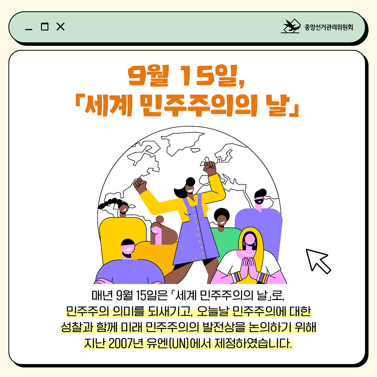 매년 9월 15일은 '세계 민주주의의 날'로, 민주주의 의미를 되새기고 오늘날 민주주의에 대한 성찰과 함께 미래 민주주의의 발전상을 논의하기 위해 지난 2007년 유엔(UN)에서 제정하였습니다.