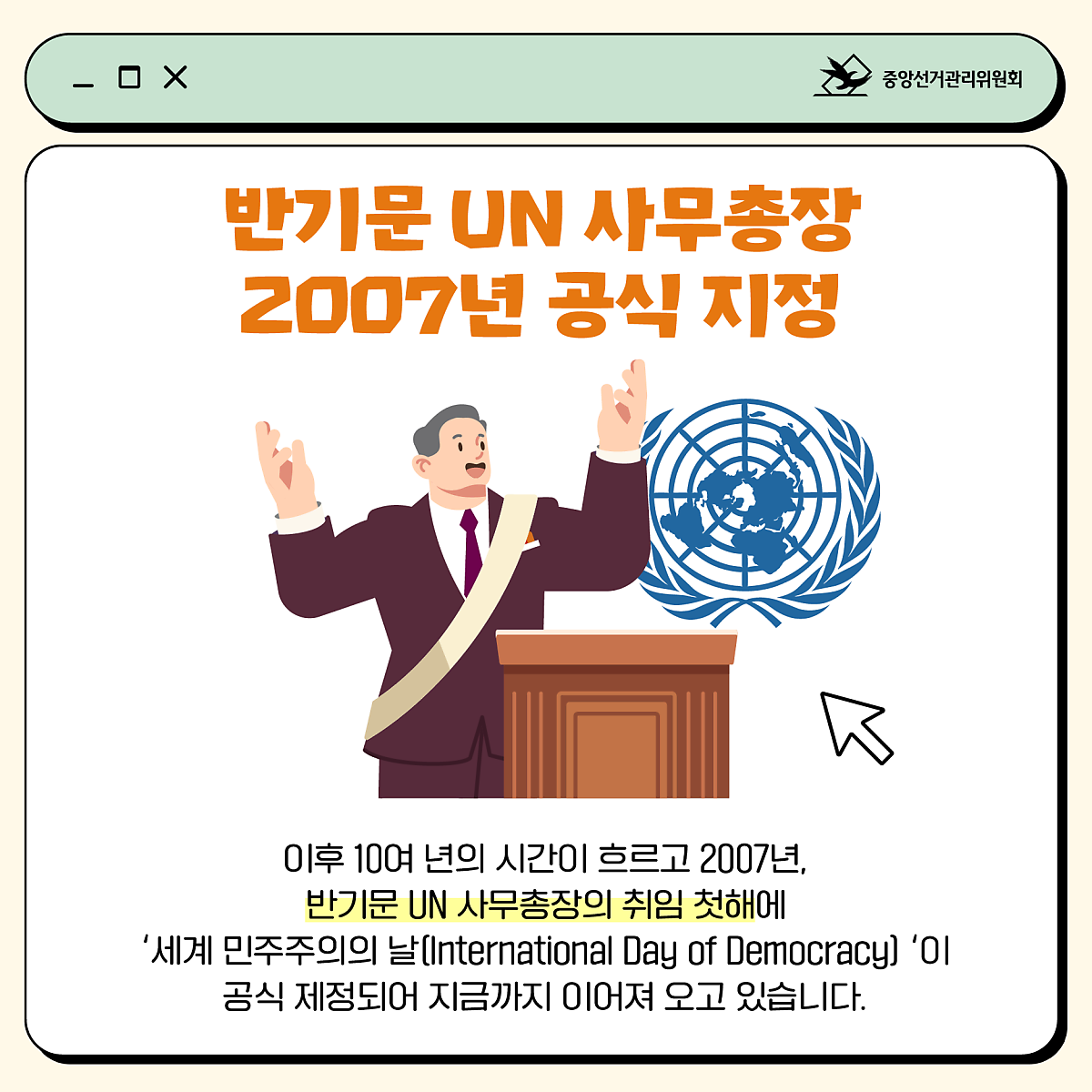 이후 10여 년의 시간이 흐르고 2007년, 반기문 UN 사무총장의 취임 첫해에 '세계 민주주의의 날(International Day of Democracy)'이