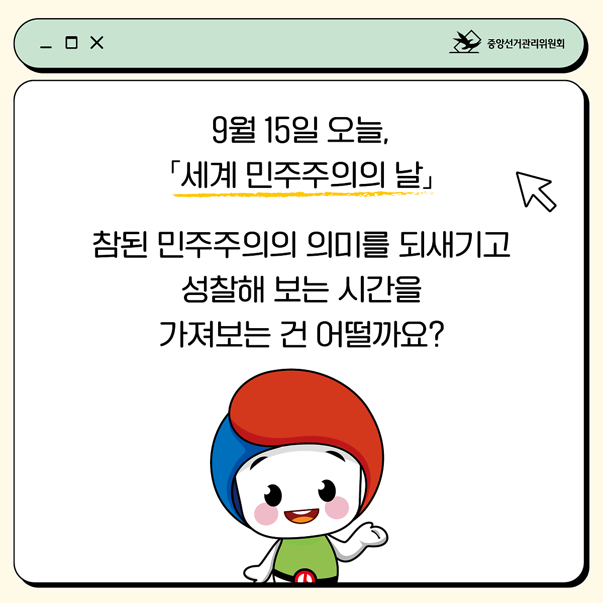 9월 15일 「세계 민주주의의 날」참된 민주주의의 의미를 되새기고 성찰해 보는 시간을 가져보는 건 어떨까요?