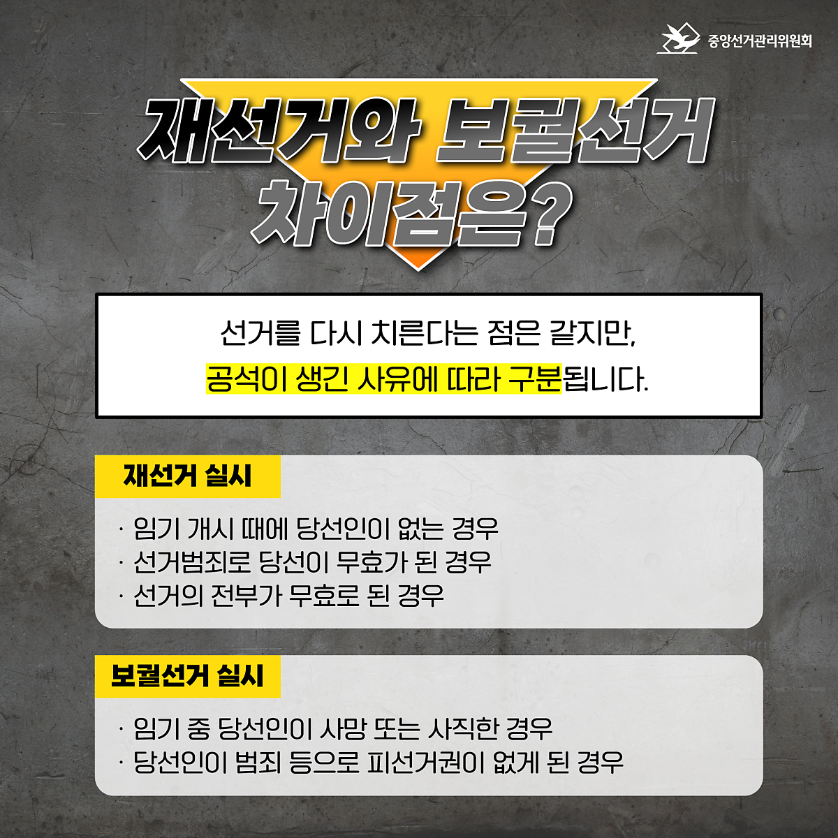 재선거와 보궐선거 모두 선거를 다시 치른다는 점은 같지만, 공석이 생긴 사유에 따라 구분됩니다.