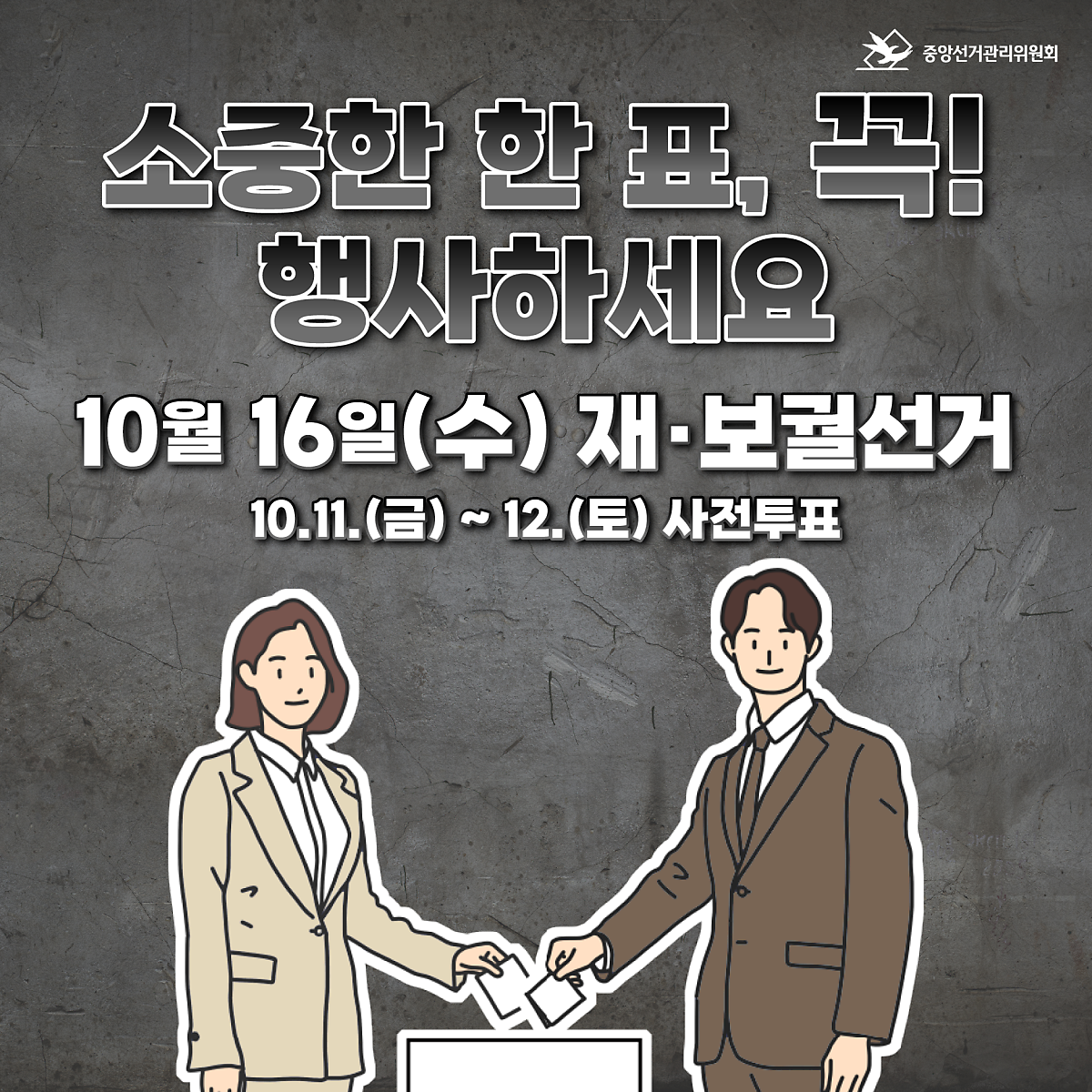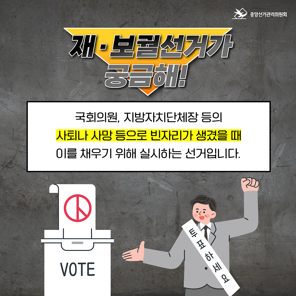 재·보궐선거는 국회의원, 지방자치단체장 등의 사퇴나 사망 등으로 빈자리가 생겼을 때 이를 채우기 위해 실시하는 선거입니다.