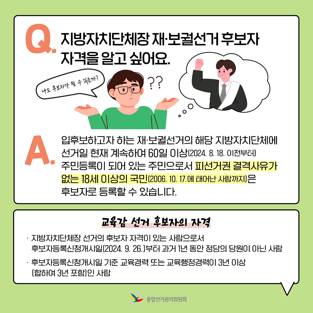 Q. 지방자치단체장 재·보궐선거 후보자 자격을 알고 싶어요.