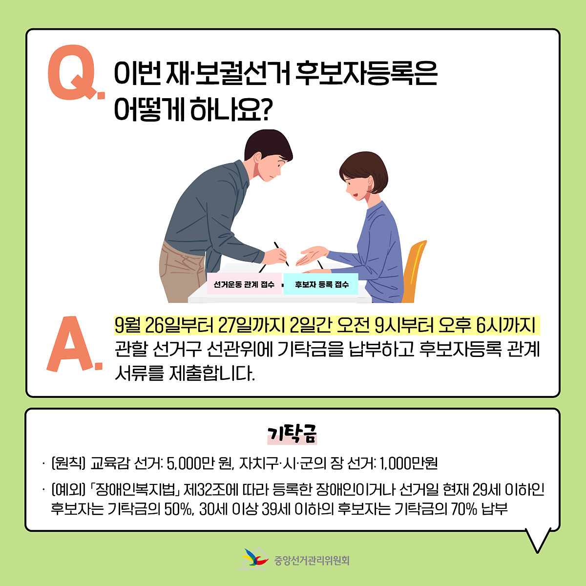 A. 9월 26일부터 27일까지 2일간 오전 9시부터 오후 6시까지 관할 선거구 선관위에 기탁금을 납부하고 후보자등록 관계서류를 제출합니다.