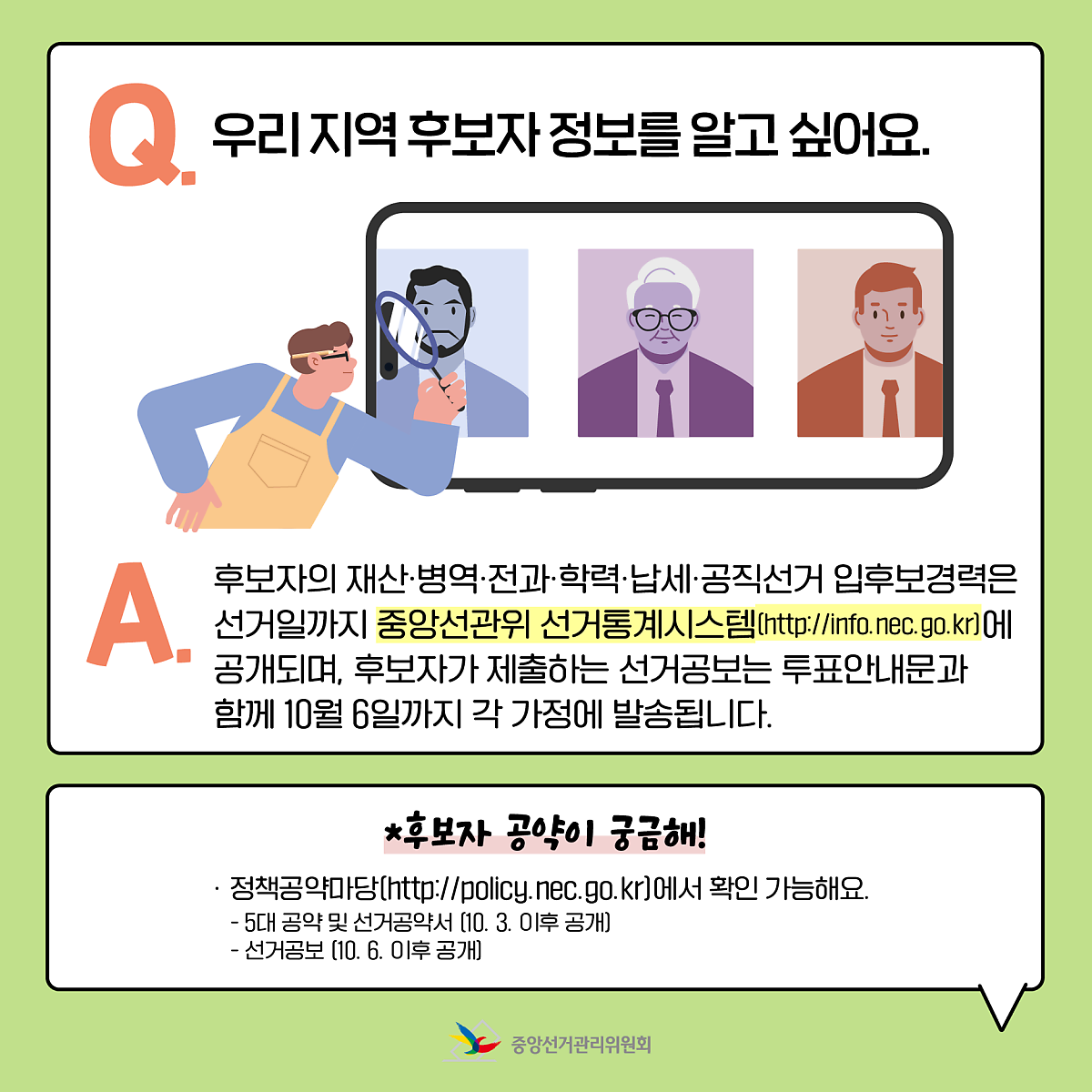 A. 후보자의 재산·병역·전과·학력·납세·공직선거 입후보경력은 선거일까지 중앙선관위 선거통계시스템(http://info.nec.go.kr)에 공개되며, 후보자가 제출하는 선거공보는 투표안내문과 함께 10월 6일까지 각 가정에 발송됩니다.
