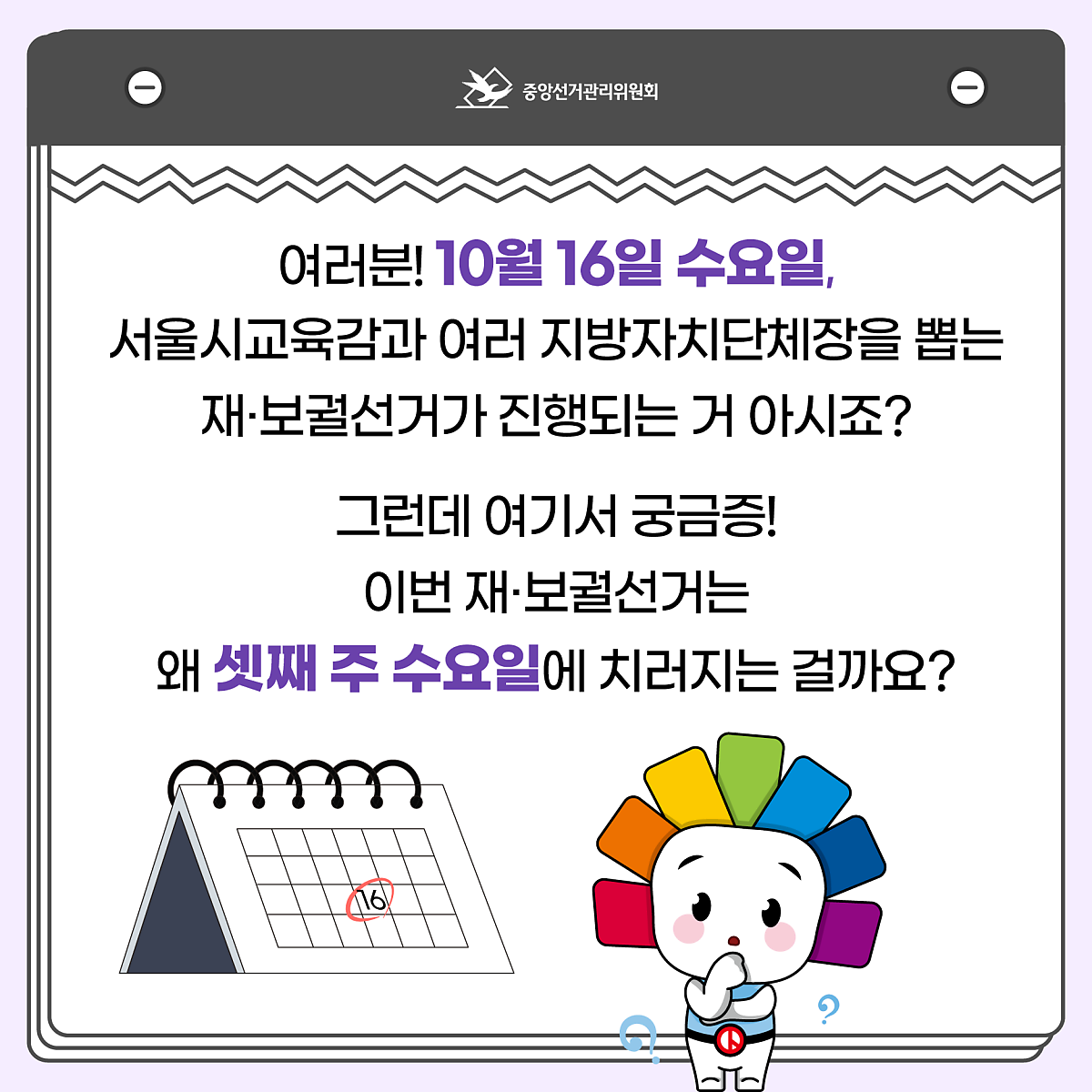 여러분! 10월 16일 수요일, 서울시교육감과 여러 지방자치단체장을 뽑는 재·보궐선거가 진행되는 거 아시죠?