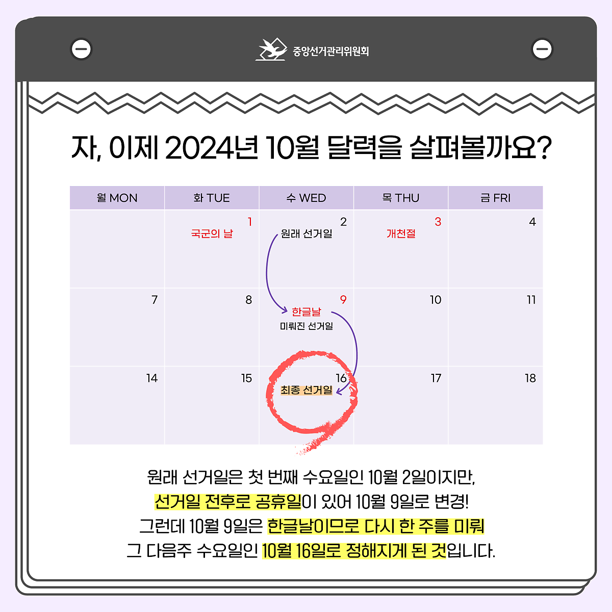 선거일 전후로 공휴일이 있어 10월 9일로 변경!