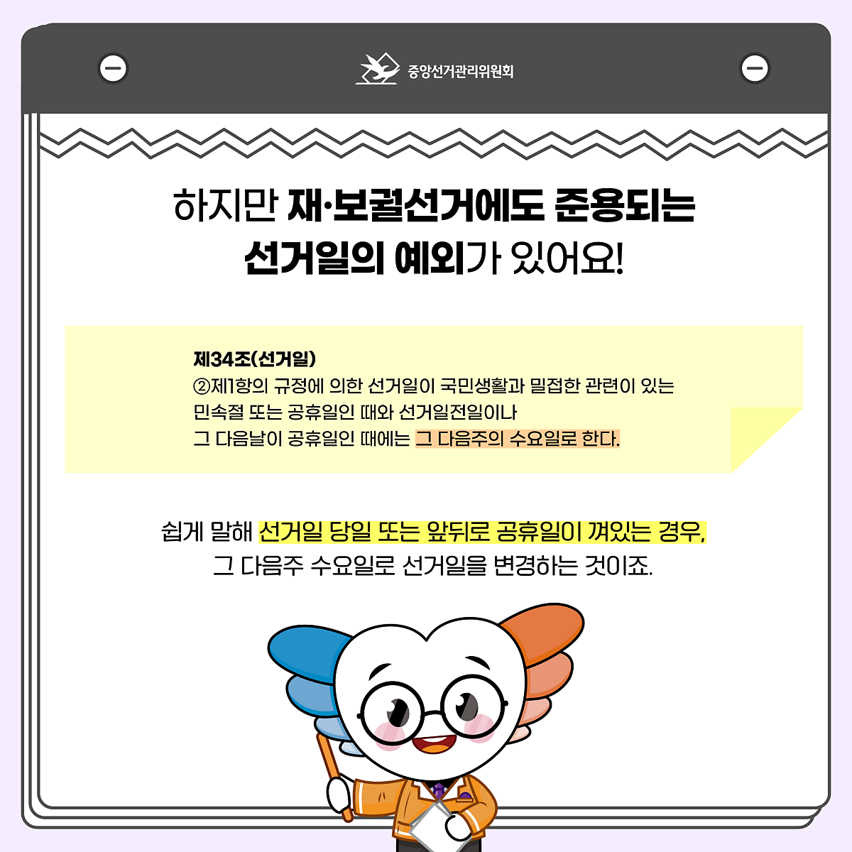 「공직선거법」 제34조에는 선거일 당일 또는 앞뒤로 공휴일이 껴있는 경우, 그 다음주 수요일로 선거일을 변경한다고 명시되어 있답니다.