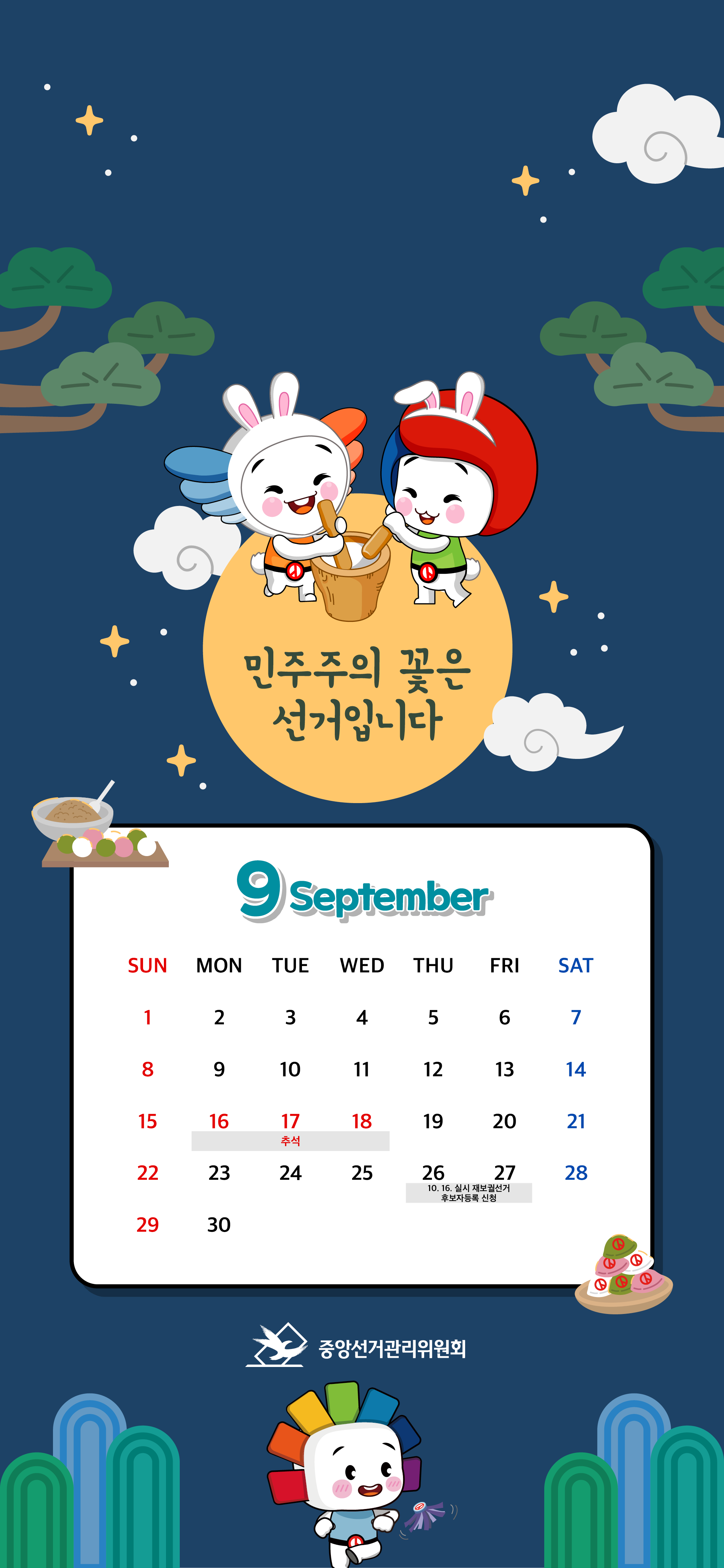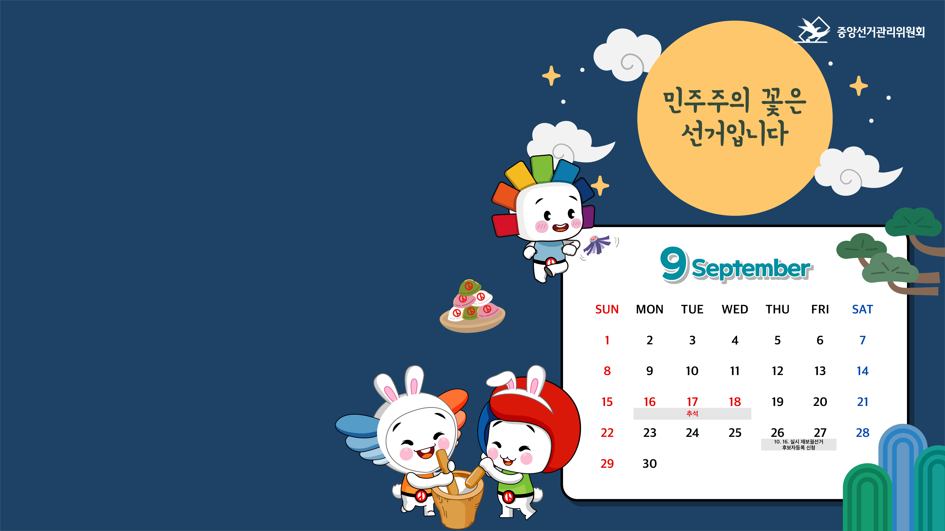 공공누리 마크 홍보과(02-3294-1035)에서 제작한 선거관리위원회 배경화면 달력(24년 9월) 저작물은 "공공누리" 출처표시-상업적 이용금지-변경금지 조건에 따라 이용할 수 있습니다. 자세한 내용은 [저작권정책]을 확인하십시오.