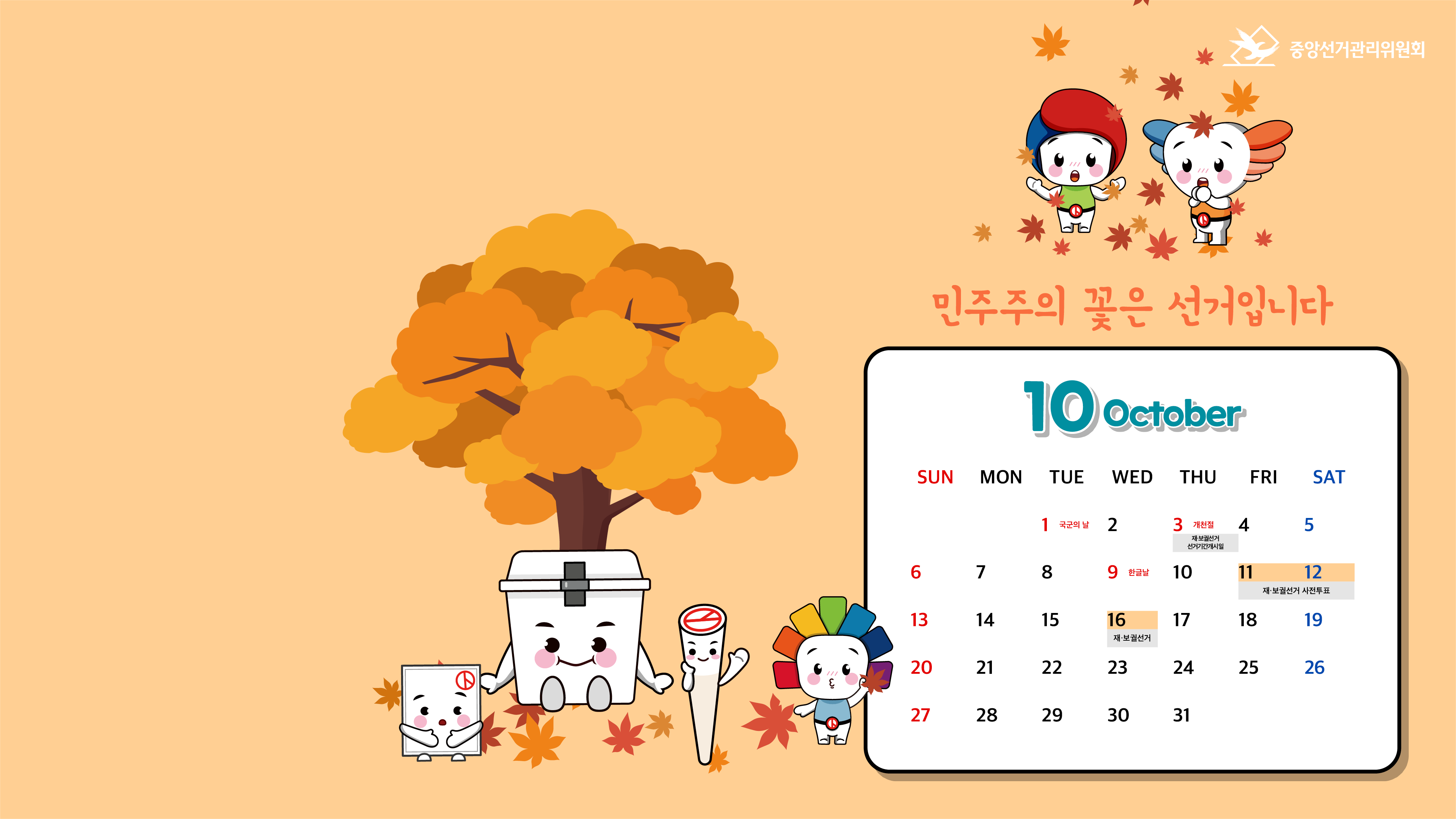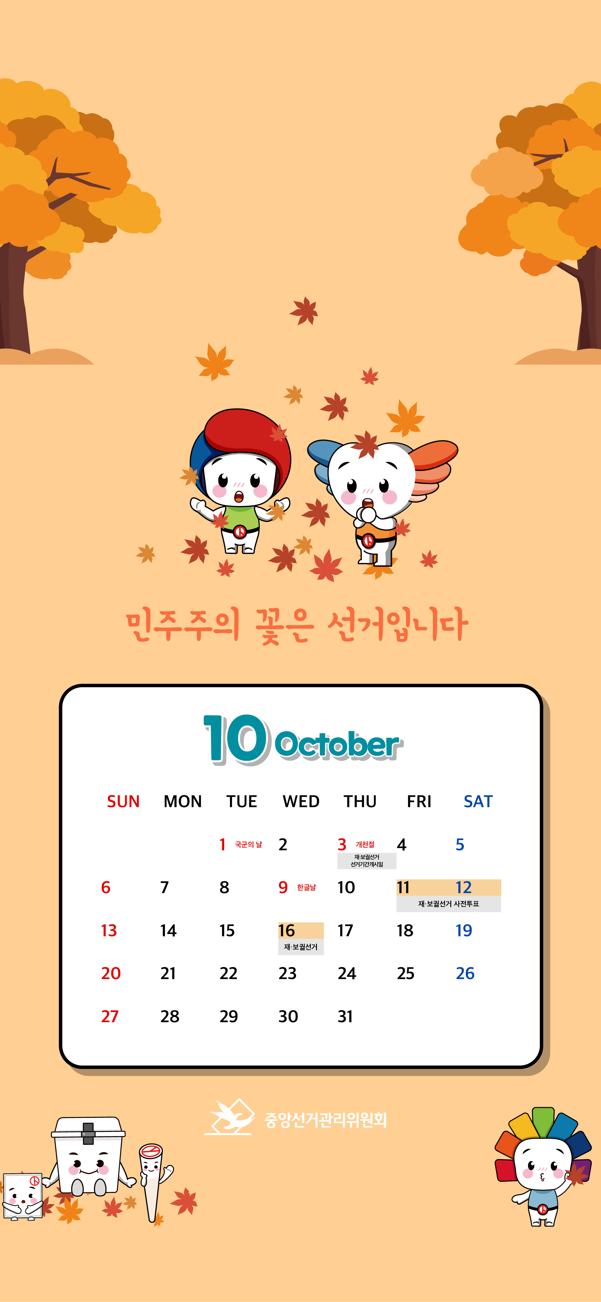 공공누리 마크 홍보과(02-3294-1035)에서 제작한 선거관리위원회 배경화면 달력(24년 10월) 저작물은 "공공누리" 출처표시-상업적 이용금지-변경금지 조건에 따라 이용할 수 있습니다. 자세한 내용은 [저작권정책]을 확인하십시오.