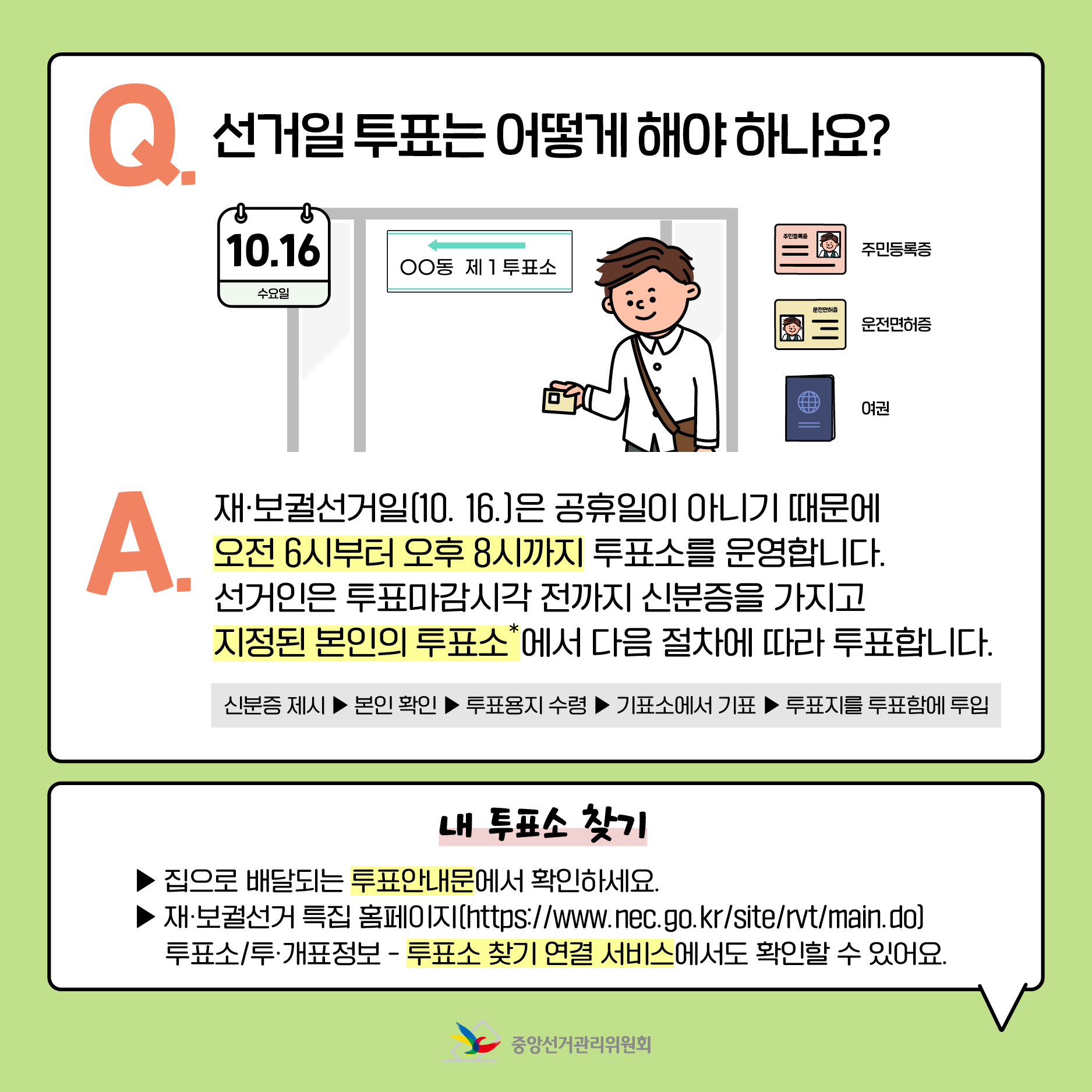 A. 재·보궐선거일(10. 16.)은 공휴일이 아니기 때문에 오전 6시부터 오후 8시까지 투표소를 운영합니다.