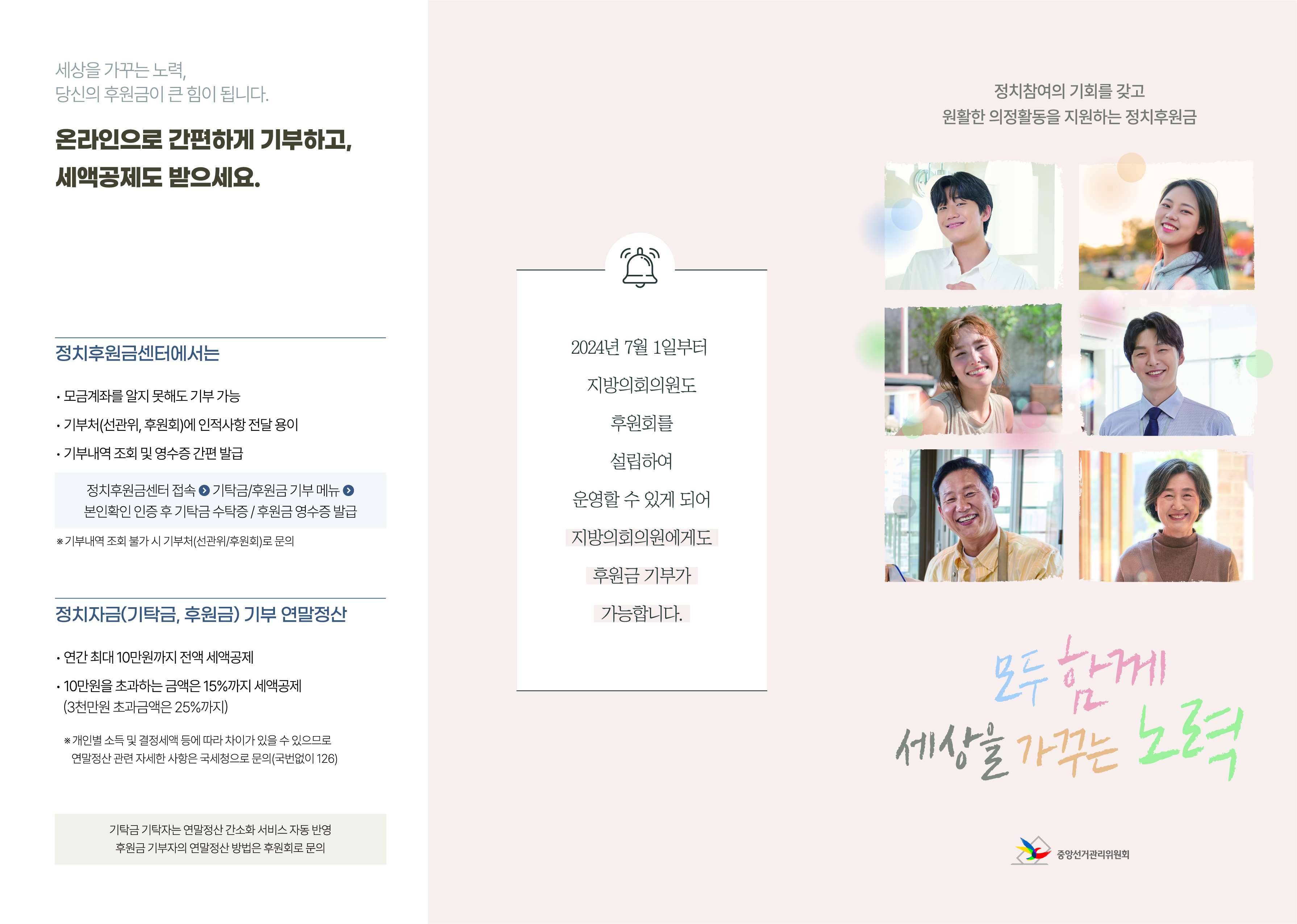 2024년 7월 1일부터 지방의회의원도 후원회를 설립하여 운영할 수 있게 되어 지방의회의원에게도 후원금 기부가 가능합니다.