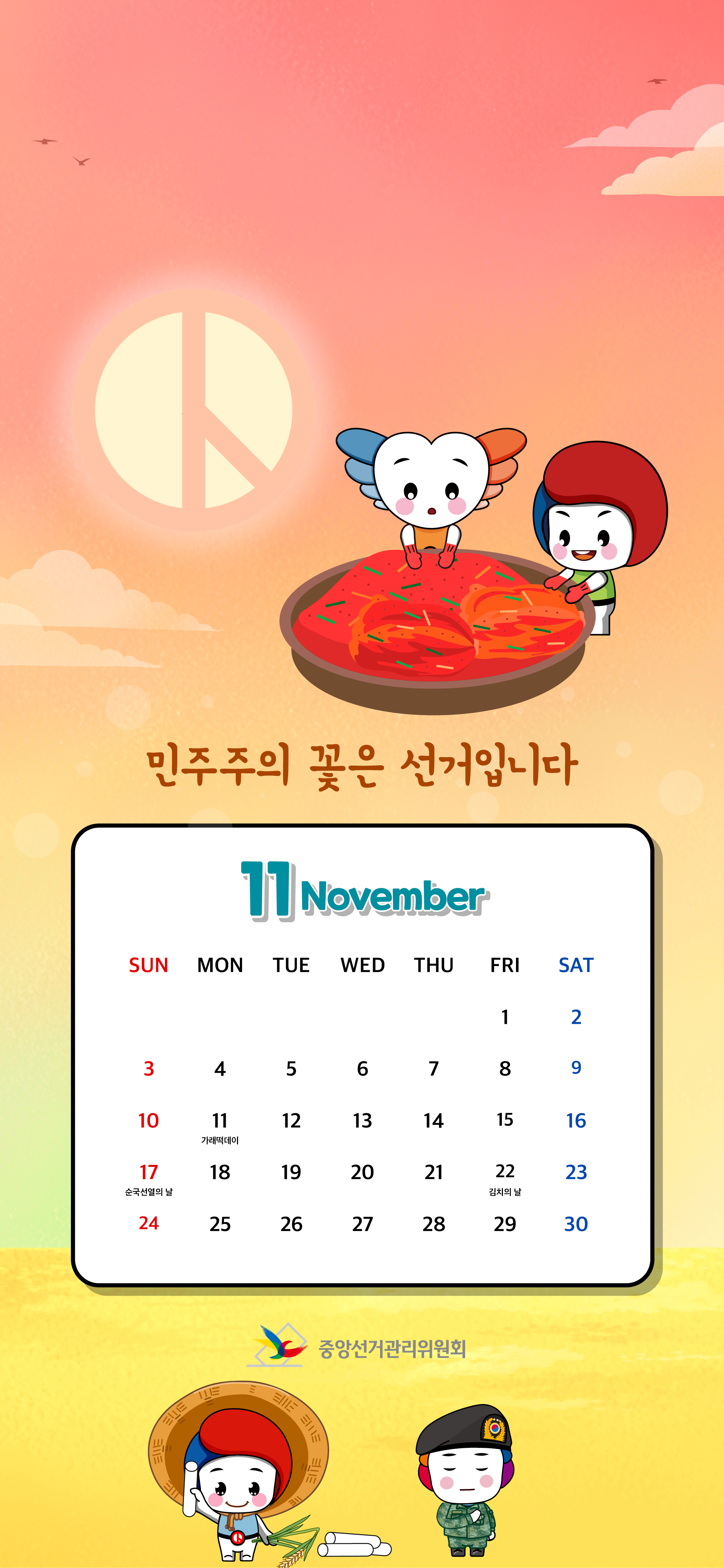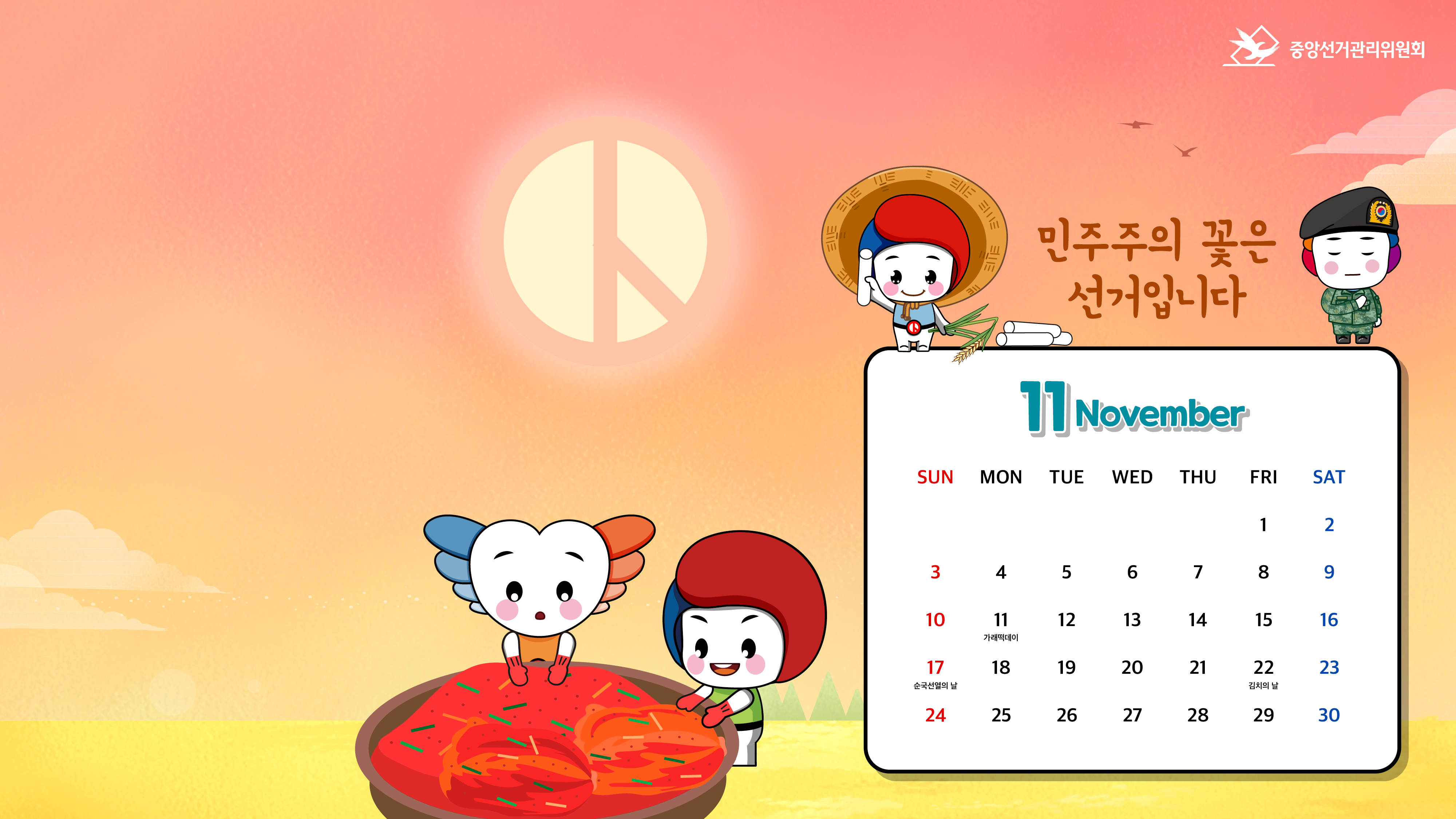 공공누리 마크 홍보과(02-3294-1035)에서 제작한 선거관리위원회 배경화면 달력(24년 11월) 저작물은 "공공누리" 출처표시-상업적 이용금지-변경금지 조건에 따라 이용할 수 있습니다. 자세한 내용은 [저작권정책]을 확인하십시오.