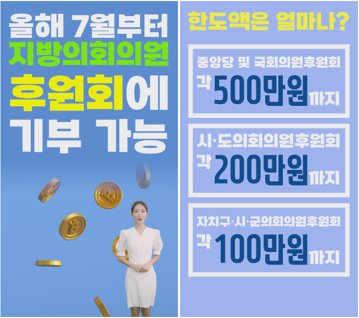올해 7월부터는 지방의회의원에 대한 후원회를 둘 수 있게 되면서 정치 참여의 기회가 확대되었다고 해요~