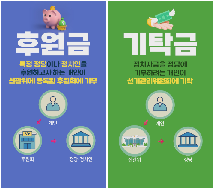 정치후원금은 특정 정당이나 정치인을 후원하고자 하는 개인이 선관위에 등록된 후원회에 기부하는 '후원금'과 정치자금을 정당에 기부하려는 개인이 선거관리위원회에 기탁하는 '기탁금'으로 구분되는데요~