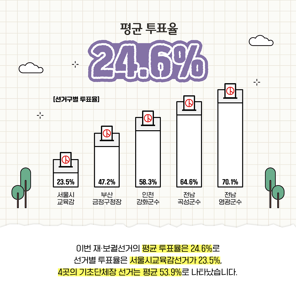 이번 재보궐선거의 평균 투표율은 24.6%로 선거별 투표율은 서울시교육감선거가 23.5%, 4곳의 기초단체장 선거는 평균 53.9%로 나타났습니다.