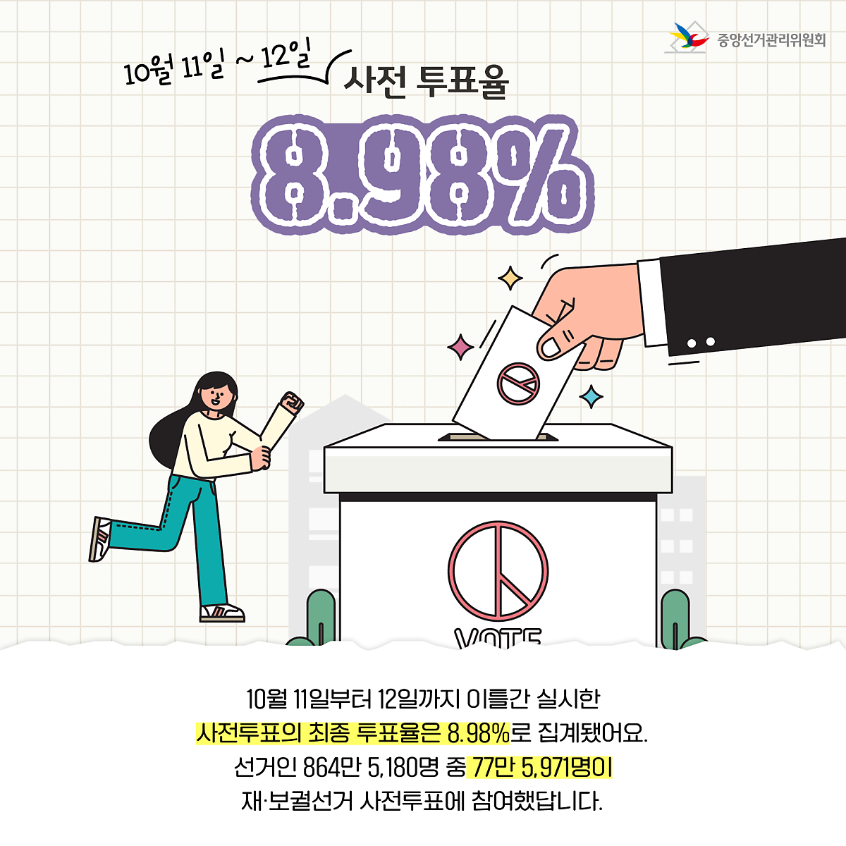 10월 11일부터 12일까지 이틀간 실시한 사전투표의 최종 투표율은 8.98%로 집계됐어요.