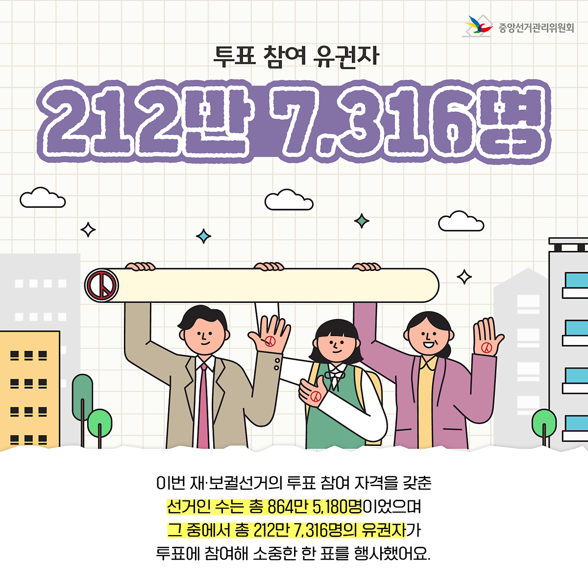 이번 재·보궐선거의 투표 참여 자격을 갖춘 선거인 수는 총 864만 5,180명이었으며, 그 중에서 총 212만 7,316명의 유권자가 투표에 참여해 소중한 한 표를 행사했어요.
