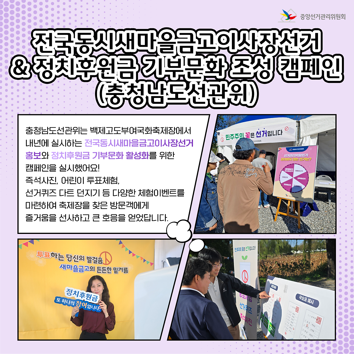 충청남도선관위는 백제고도부여국화축제장에서 내년에 실시하는 전국동시새마을금고이사장선거 홍보와 정치후원금 기부문화 활성화를 위한 캠페인을 실시했어요!