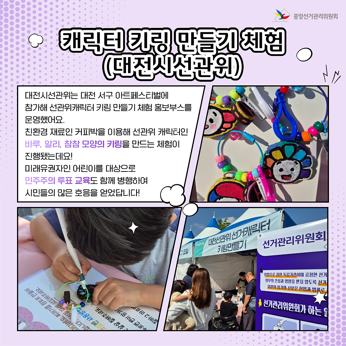 대전시선관위는 대전 서구 아트페스티벌에 참가해 선관위캐릭터 키링 만들기 체험 홍보부스를 운영했어요.