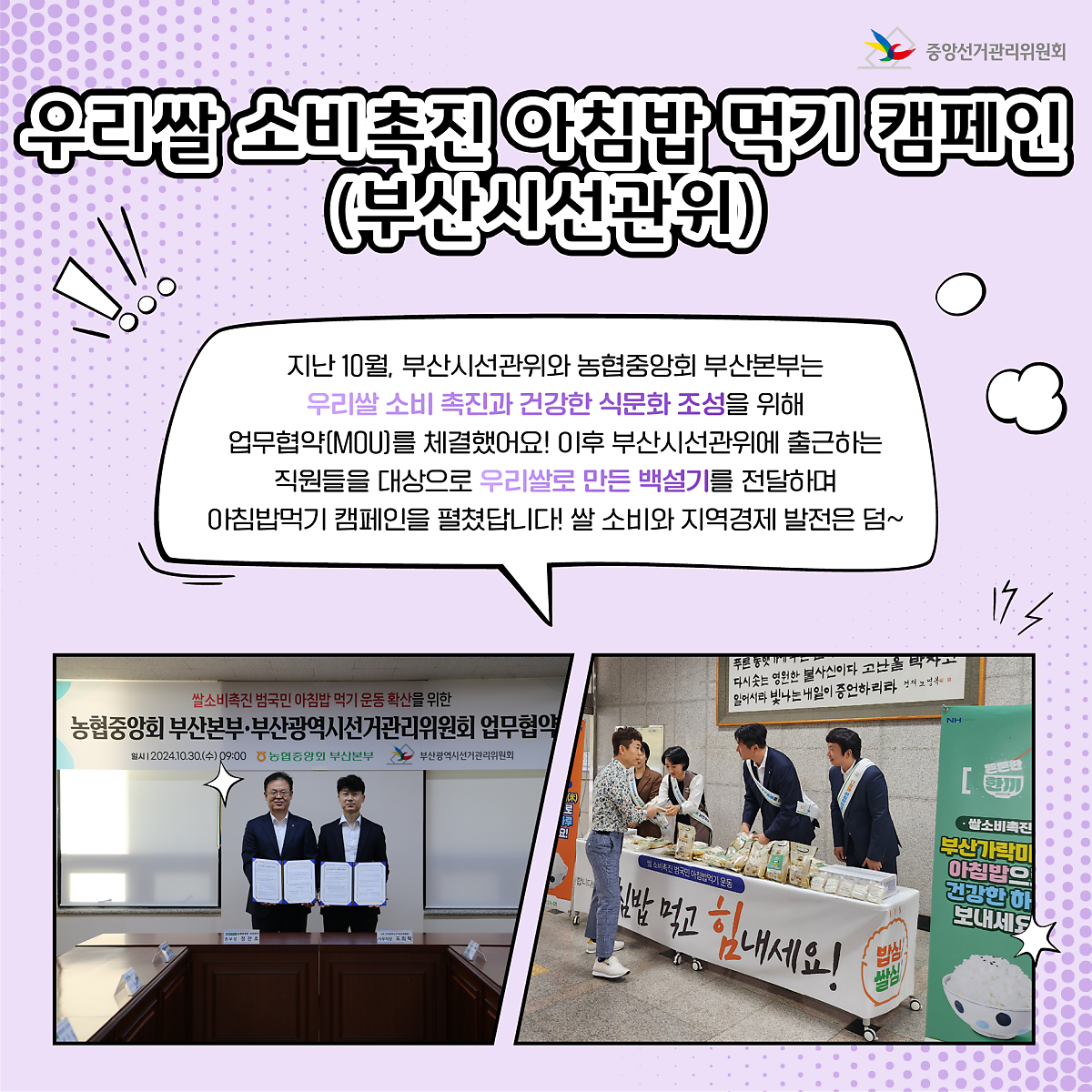 지난 10월, 부산시선관위와 농협중앙회 부산본부는 우리쌀 소비촉진과 건강한 식문화 조성을 위해 업무협약을 체결했어요!