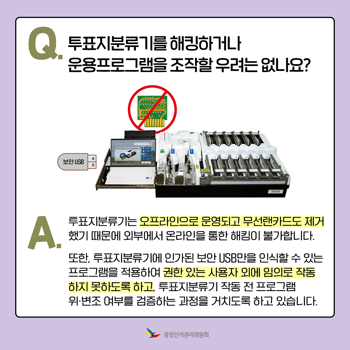 Q. 투표지분류기를 해킹하거나 운용프로그램을 조작할 우려는 없나요?