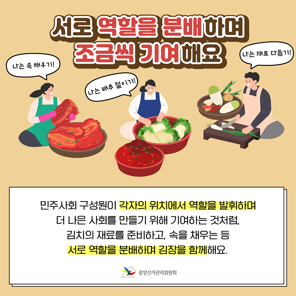민주사회 구성원이 각자의 위치에서 역할을 발휘하며 더 나은 사회를 만들기 위해 기여하는 것처럼, 김치의 재료를 준비하고, 속을 채우는 등 서로 역할을 분해하며 김장을 함께해요.