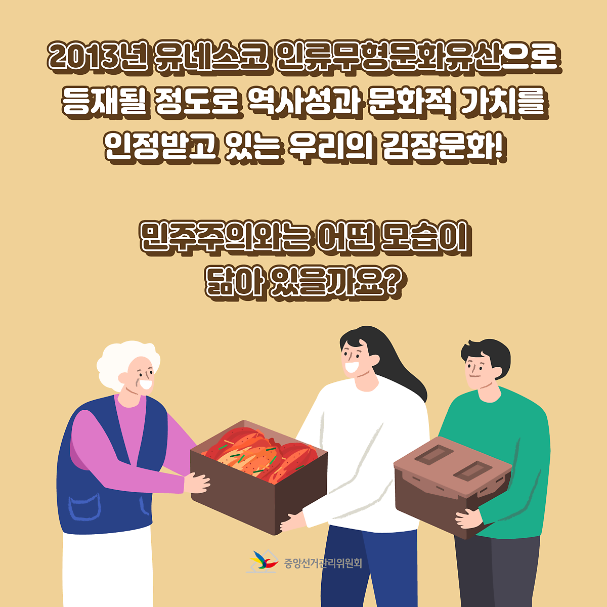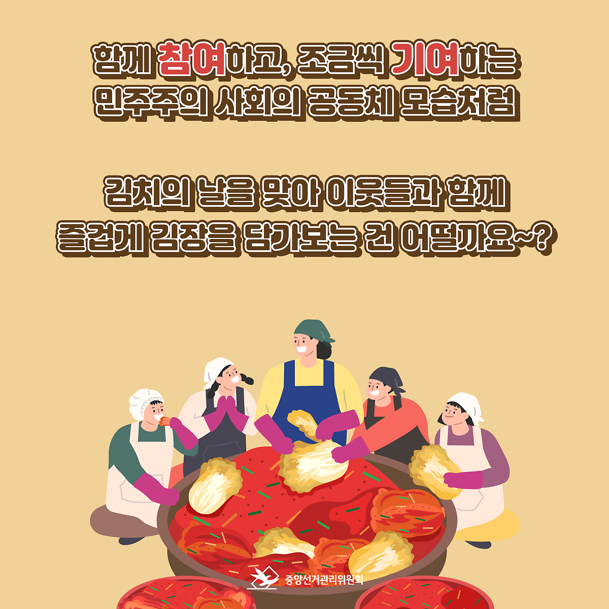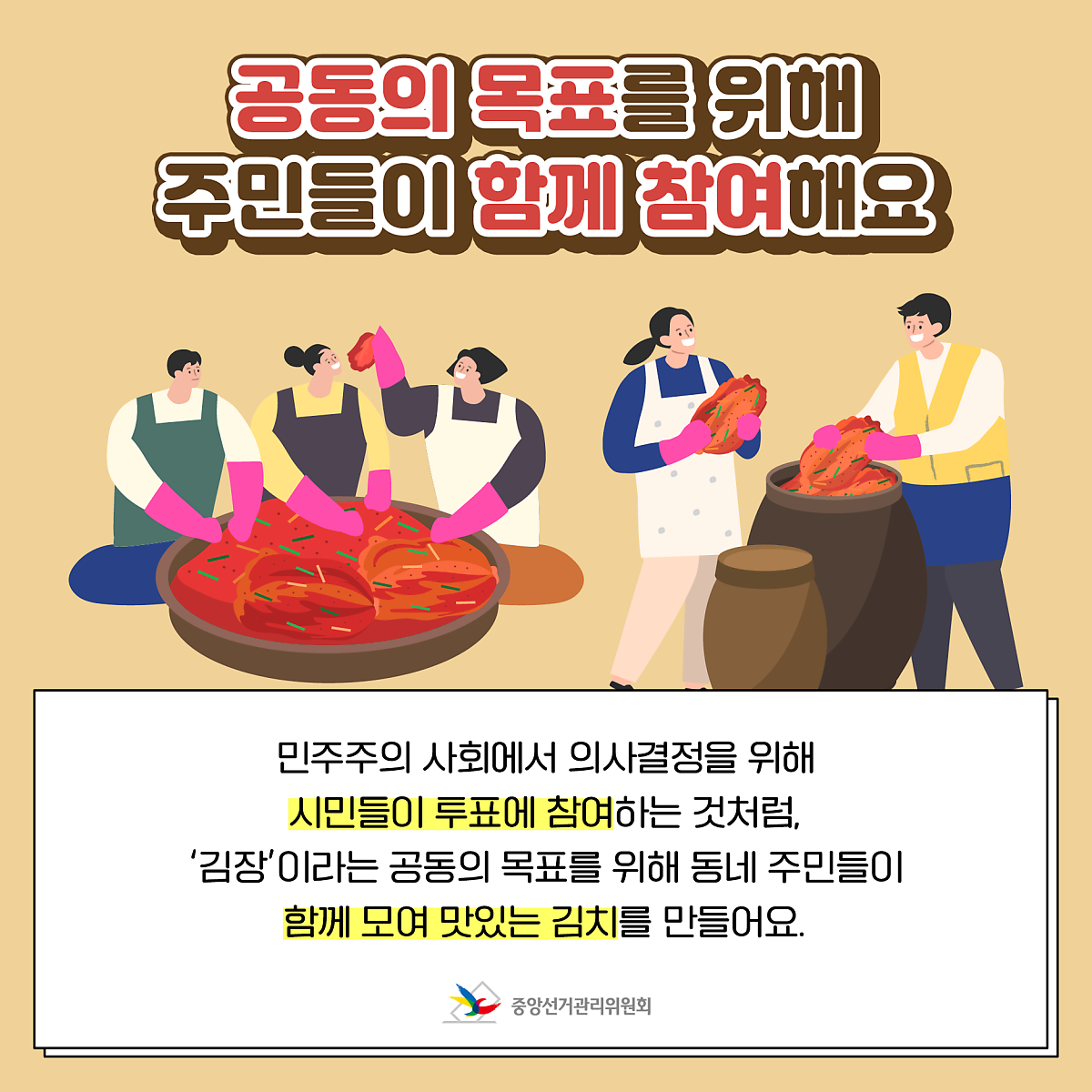 민주주의 사회에서 의사결정을 위해 시민들이 투표에 참여하는 것처럼, '김장'이라는 공동의 목표를 위해 동네 주민들이 함께 모여 맛있는 김치를 만들어요.