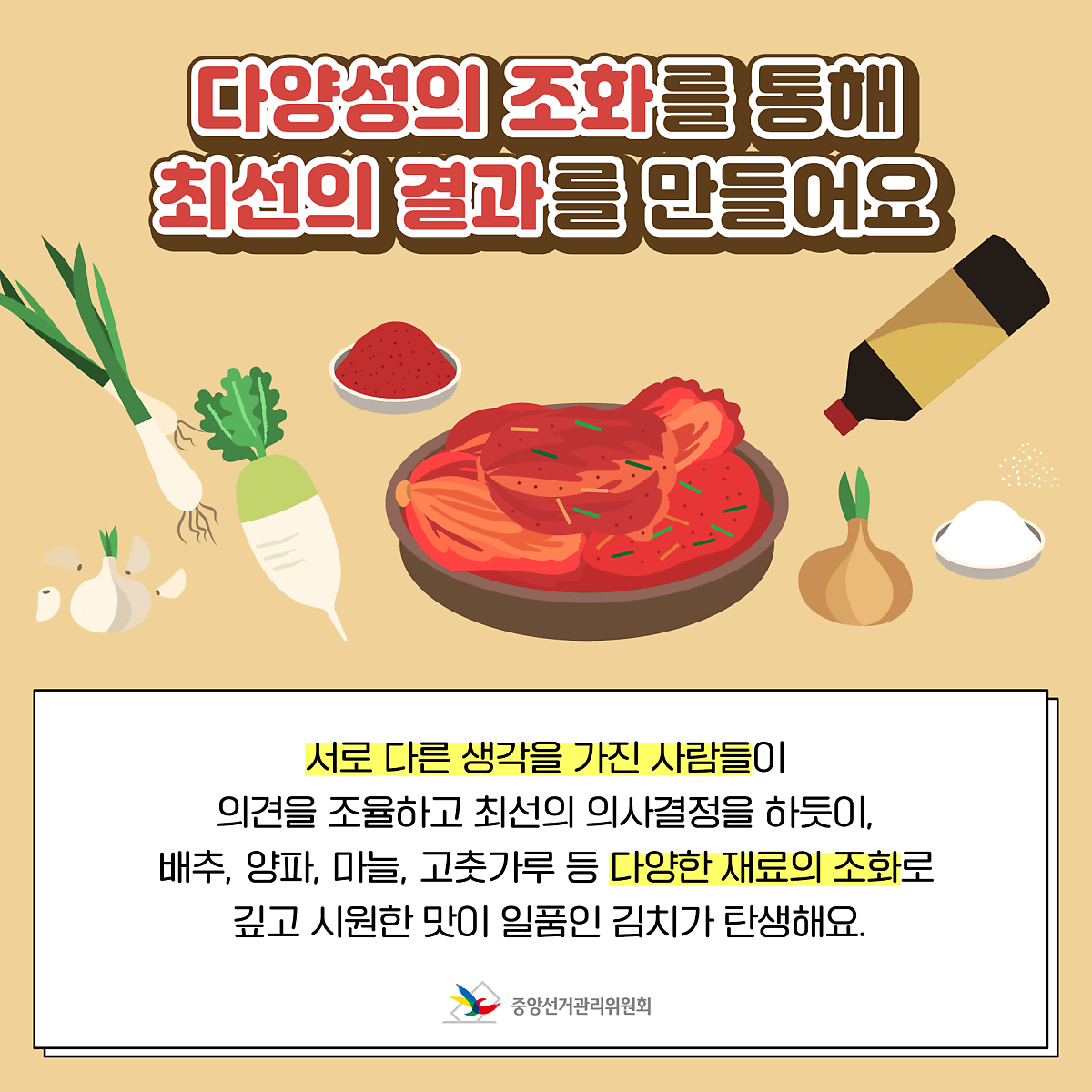 서로 다른 생각을 가진 사람들이 의견을 조율하고 최선의 의사결정을 하듯이, 배추, 양파, 마늘, 고춧가루 등 다양한 재료의 조화로
