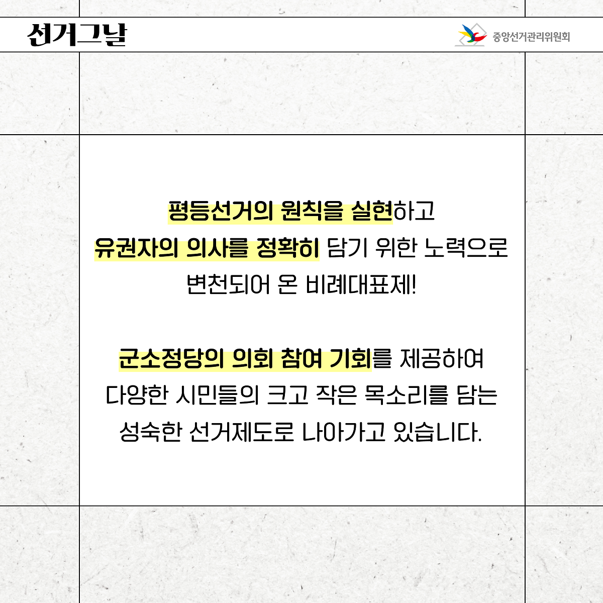 군소정당의 의회 참여 기회를 제공하여 다양한 시민들의 크고 작은 목소리를 담는 성숙한 선거제도로 나아가고 있습니다.