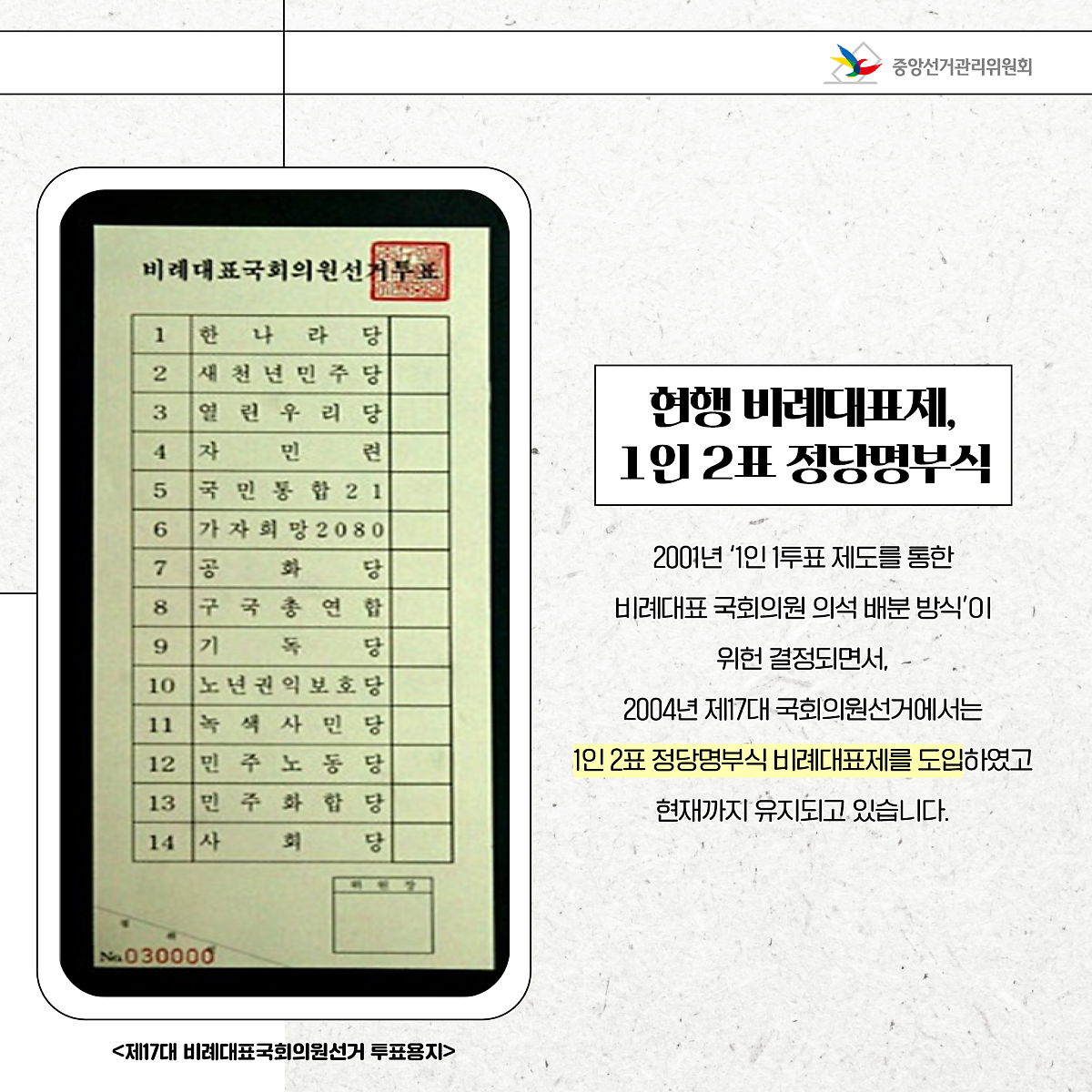 2001년 '1인 1투표 제도를 통한 비례대표 국회의원 의석 배분 방식'이 위헌 결정되면서, 2004년 제17대 국회의원선거에서는 1인 2표 정당명부식 비례대표제를 도입하였고 현재까지 유지되고 있습니다.
