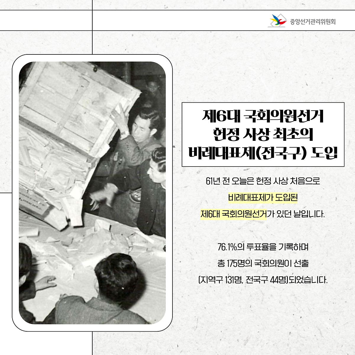 61년 전 오늘은 헌정 사상 처음으로 비례대표제가 도입된 제6대 국회의원선거가 있던 날입니다.