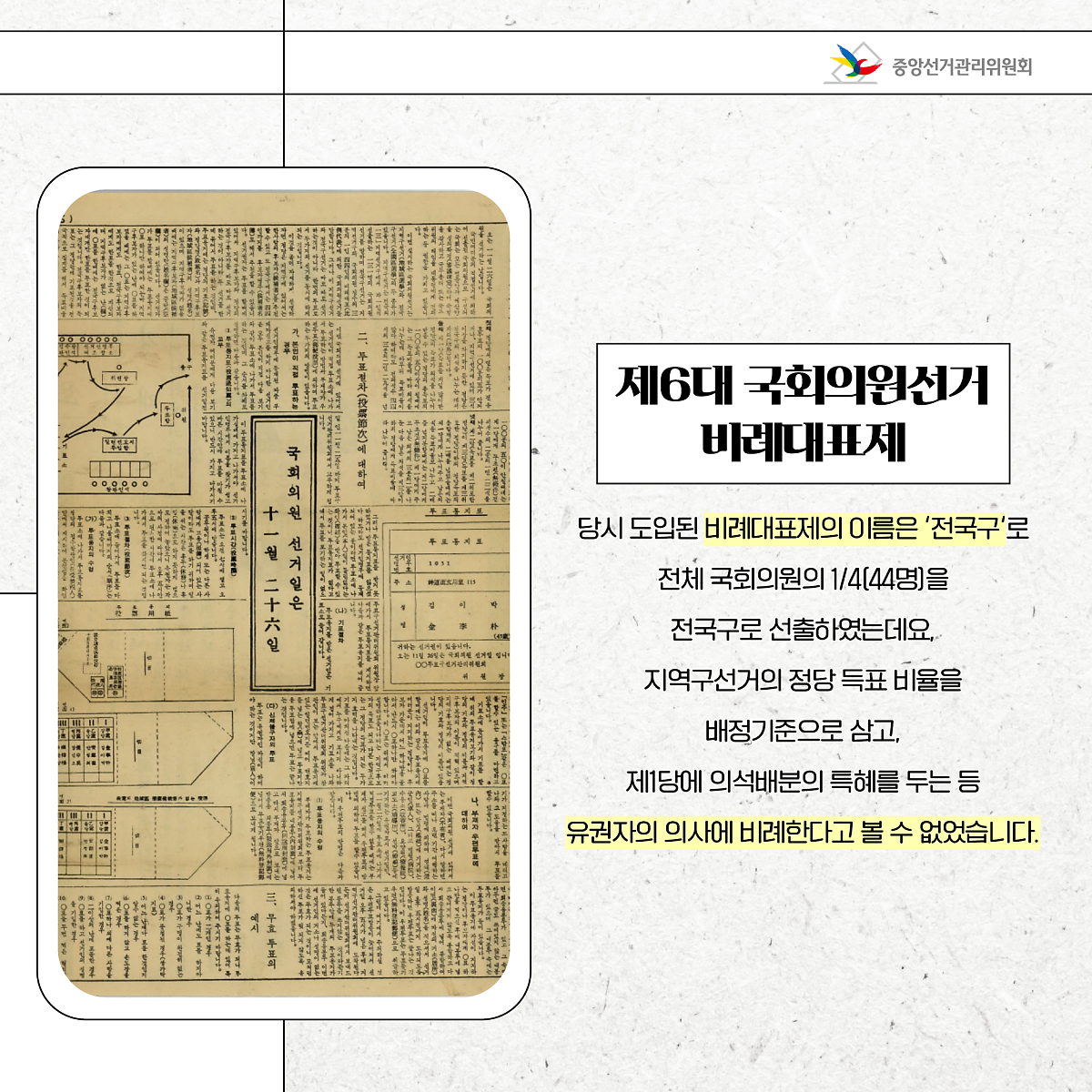 당시 도입된 비례대표제의 이름은 '전국구'로 전체 국회의원의 1/4(44명)을 전국구로 선출하였는데요.