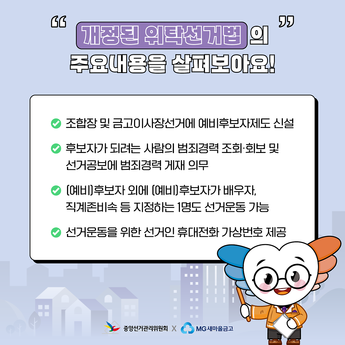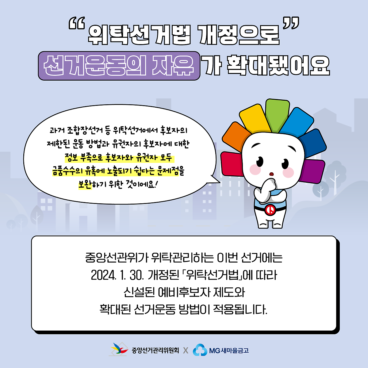 중앙선관위가 위탁관리하는 이번 선거에는 2024. 1. 30. 개정된 「위탁선거법」에 따라 신설된 예비후보자 제도와 확대된 선거운동 방법이 적용됩니다.