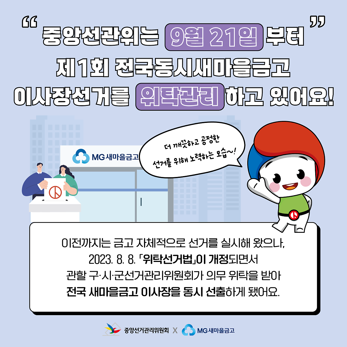 이전까지는 금고 자체적으로 선거를 실시해 왔지만, 2023. 8. 8. 「위탁선거법」이 개정되면서 관할 구·시·군선거관리위원회가 의무 위탁을 받아 전국 새마을금고 이사장을 동시 선출하게 됐어요.