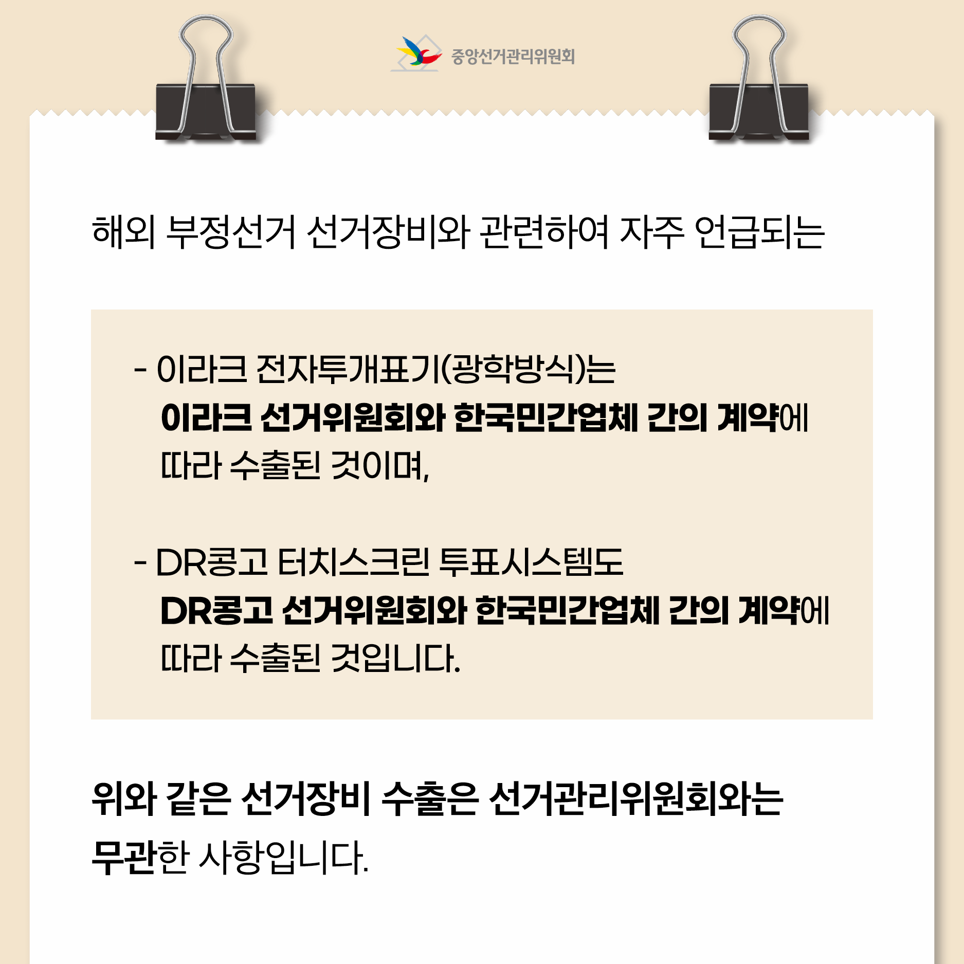 위와 같은 선거장비 수출은 선거관리위원회와는 무관한 사항입니다.
